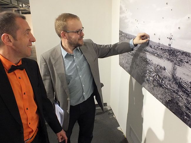 Собственно, парковочные боксы и разметку подземный выставочный зал сохранил. Спускаться в него надо по пандусу, подсвеченному синим неоновым светом. В зале-ангаре по потолку ползут трубы, провода. Пространство кромсают фальшстены и выгородки. В общем, создаётся очень сложное впечатление какой-то пелевенщины наяву. Помнится, у Пелевина был такой роман про советский космос – «Омон Ра» называется. В нём чёрным по белому написано, что все якобы космические полёты в СССР проводились на засекреченной ветке московского метро. Очень этот роман уместно вспомнить на выставке.