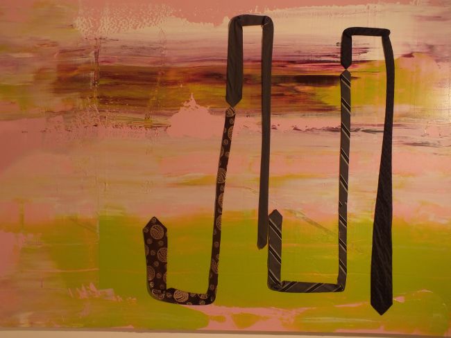 На новой выставке герои чуть поскромнее: домов, катеров, машин нет. Имеется живопись, пародирующая абстрактный экспрессионизм, где силовыми линиями композиции становятся приклеенные к холсту галстуки от известных торговых марок Germes, Gucci, Dolce & Gabbana. Остроумный ход: мировой абстракционизм давно апроприирован обществом потребления и украшает дорогие буржуазные апартаменты и офисы, куда приходят люди в таких вот галстуках. Товар – деньги – товар.