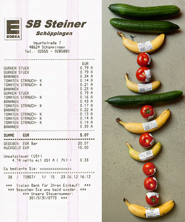 Открывающая выставку «Shopping poetry» Иварса Гравлейса занимает целую стену. Большие цветные фотографии транспортных лент, подающих товары к кассам сетевых магазинов вроде ИКЕА, Перекрёстка или Ашана, перемежаются реди-мейдами – оформленными в рамку кассовыми чеками. Набор товаров на каждой ленте – метафорический портрет покупателя, а все вместе они складываются в ироничную поэму о жизни современного города.