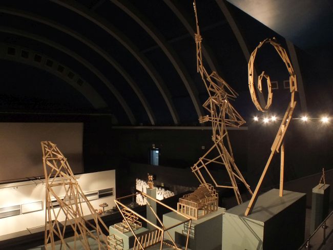 Под куполом советского кинотеатра «Ударник» жирафами выгибаются жёлтые конструкции из дерева. Подойдёшь поближе – поймёшь, что это объекты из проекта «Утопический скелет» краснодарцев – группы ЗИП. Сколоченные из деревянных реек дома-коммуны, монументальные скульптуры, венчавшие наши павильоны и площади, какие-то посохи, напоминающие абстрактный минимализм… Всё это выветрено, бесплотно, обнажено. Можно считать эти скульптуры обнажением нового энергетического каркаса. А можно вспомнить великого архитектора-концептуалиста Юрия Аввакумова и увидеть очевидные параллели к его каркасной презентации конструктивистских монументов, которые неоднократно экспонировались и были для меня, например, символом экзистенциальной драмы и утопизма мышления о будущем исключительно в модальности прошедшей. Палеонтолог-реконструктор – вот, кто приходит на ум!