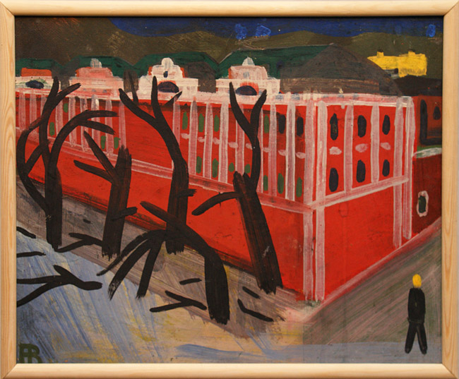 Хотя мир его живописи аскетичен и строг, безыскусен и даже возвышенно суров, он отнюдь не сентиментален – сильнейшее переживание теплоты и радости возникает всякий раз, когда рассматриваешь эти работы. Подобно архитектору, он строит пространство своих пейзажей, располагая элементарную геометрию домов в нехитрой комбинации объёмов, скупо впуская туда двух-трёх одиноких прохожих. Уже в ранних работах 1950-х годов появляется верхний взгляд: город увиден умопостигаемым взором откуда-то с высоты как единое целое. Он строит мир как архитектор-минималист, мысля ясными, завершёнными объёмами форм, расставляя дома, корабли, деревья туда, где им надлежит быть. В этой прозрачности честного делания есть иррациональный момент: его завораживает пространство неуловимой сферической изогнутости. Линии горизонта, будь это Стрельна или Обводный канал, круглятся, создавая ощущение опрокинутости.