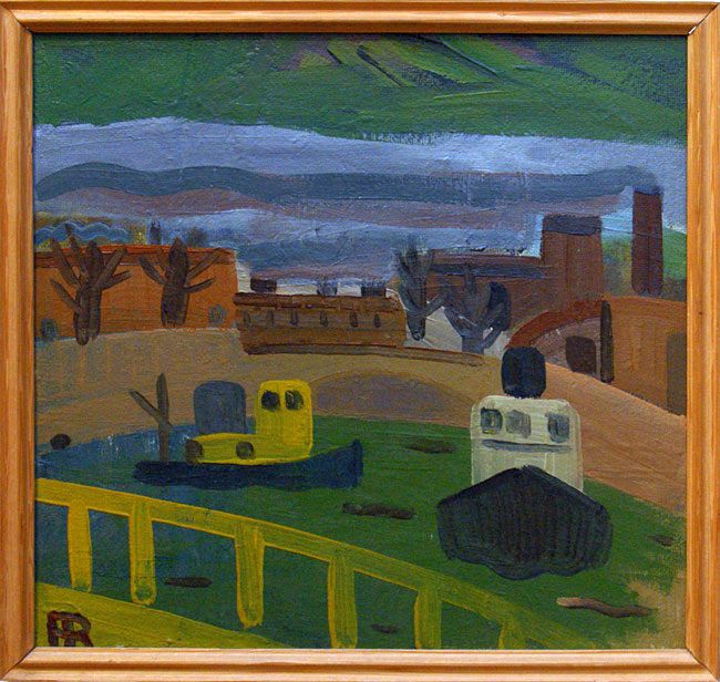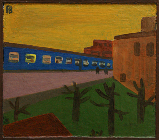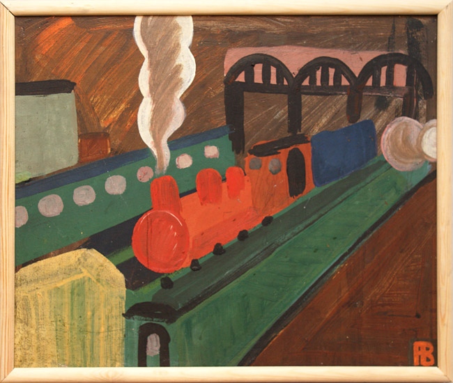 Художника не интересует световоздушная подвижная среда, изменчивость состояний, вместо глубины оптической перспективы – плоскостность предметного мира и стереометрия умопостигаемого пространства. Инфантильность, присущая его домам и деревьям, кораблям и лодкам, людям и машинам, предметам ближнего плана, проявляется в детско-наивистком умении обобщать, не засушивая, сохраняя доверительность и теплоту, что близко живописи гениальных самоучек, например, Нико Пиросмани.