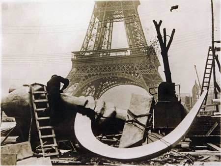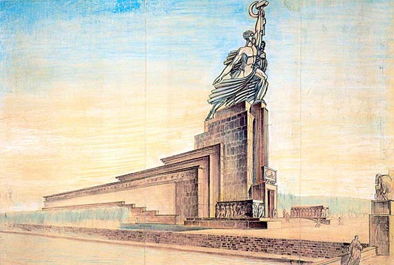 Обратимся сперва к истории. Скульптура «Рабочий и колхозница» была среди лучших артефактов Парижской международной выставки 1937 года. Она проектировалась как завершение павильона СССР. Сам павильон был создан по замыслу Бориса Иофана неким ступенчатым ангаром с ленточными окнами и протяжённой анфиладой. Динамический силуэт его очень кстати подходил под пьедестал устремлённой в будущее скульптуры Веры Мухиной. Сама скульптура, как и павильон, была выбрана на конкурсной основе. Вера Мухина изобразила двух гегемонов пролетарского государства, рабочего и крестьянку, слившихся в едином порыве. Они заставляют вспомнить скульптуру V века до н.э. античных тираноборцев, Гармодия и Аристогитона. В руках у новых героев атрибуты нового символа страны: серп и молот. За колхозницей тянется мощными складками созданный из стали велум – ткань, словно парус, осеняющая священные, героические деяния. Павильон со скульптурой стоял прямо напротив павильона-монумента фашистской Германии, венчавшегося орлом со свастикой. Вспоминает очевидец, сын и помощник Веры Мухиной Всеволод Замков: «…французские и особенно испанские рабочие, проходя мимо строительства, заходили на площадку и приветствовали стоявшие ещё на земле огромные головы статуй высоким движением руки с сжатыми в кулак пальцами – общепринятым в то время знаком международной солидарности рабочих...