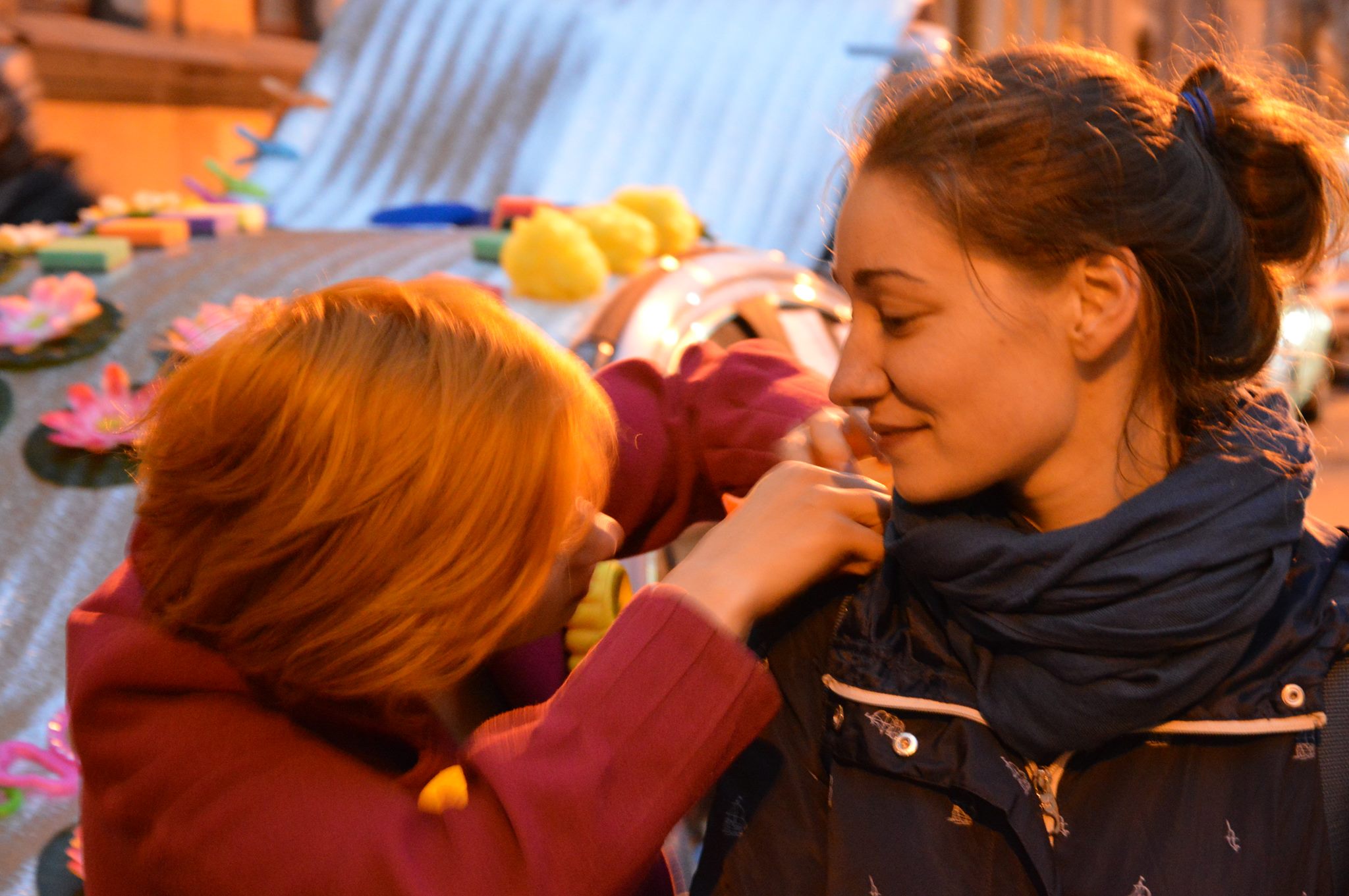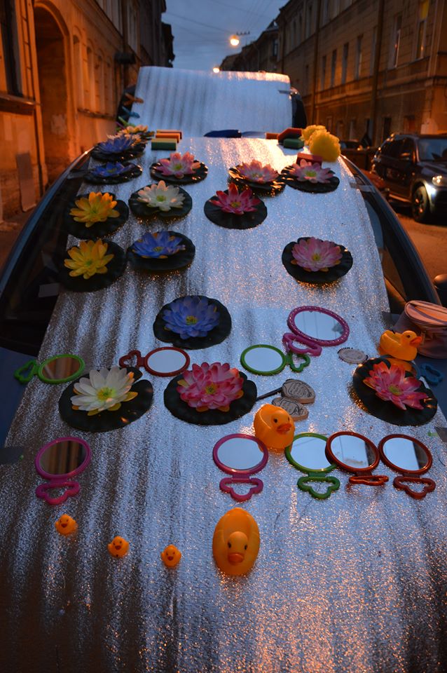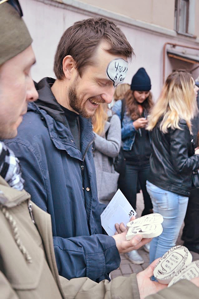 Лера Лернер пришивает на одежду яркие зазывные предметы и расписывает глаза всем желающим, «заражая» их «лернянкой» – одной из разновидностей искусства, живущего прямо в городской среде
