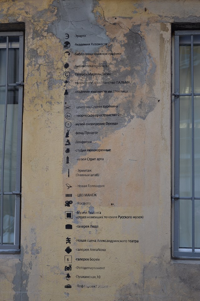 Целый ряд проектов фестиваля предполагал активное вовлечение жителей в процесс создания работы и даже непосредственное их участие. Алена Терешко облюбовала двор на Галерной улице, где знакомство с жителями дома, его старожилами, позволило художнице на основе их рассказов составить портрет дома и его обитателей («Соседи»). В сумерках на колоссальных размеров брандмауэр проецировалась видеоанимация, где глухая стена дома высвечивалась светом историй, рассказанных голосами героев её исследования, так, что создавался эффект раскрытия внутреннего бытия дома, обращённого в прошлое. Трогательные лирически-исповедальные истории вкупе с таинственной атмосферой двора со светящимися в темноте окнами создавали эффект погружения в саму живую ткань жизни, скрытую от посторонних глаз. Надежда Чернякевич решила привлечь к своему проекту пожилых людей, дав им возможность провести ряд кулинарных мастер-классов прямо во дворах. Тем самым художница создавала условия для изменения отношения к людям пожилого возраста со стороны их соседей, поскольку сейчас в центре города мы наблюдаем картину резкой социальной и экономической дифференциации его жителей. Во дворе, где женщины-кулинары делились своим опытом приготовления еды, на стене дома разместилась карта-схема метрополитена Петербурга, где с помощью условных символов обозначались адреса, где располагаются различные институции, занимающиеся современным искусством, – музеи, галереи, лофты, библиотеки, студии, арт-пространства и др. Это карта одного из кураторов фестиваля Анастасии Скворцовой, справедливо полагающей, что такого рода информация должна быть доступна жителям и гостям города.