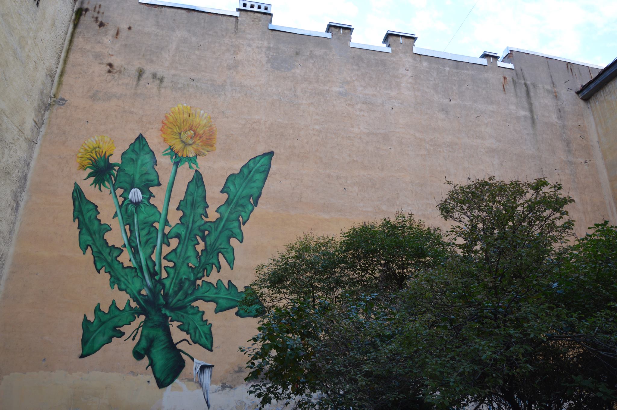 На этом же брандмауэре петербургский художник Стас Багс создал монументальную фреску, увековечив расцветающий одуванчик со срезанным корнем, напоминающим сердце. Изображенный как на гербарии, мёртвый цветок жил, чудесным образом паря на стене, подобно вещам-видениям на картинах Рене Магритта. Багс целенаправленно работает как стрит-арт-художник, и его гигантский кит, созданный для фестиваля 2014 года, до сих пор жив на стене дома в Петроградском районе.