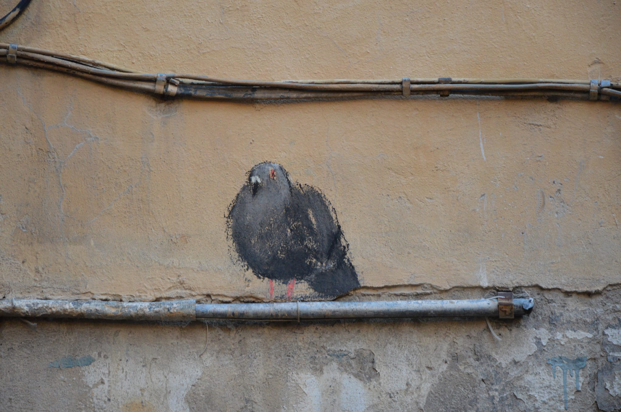 Однако особенность большинства фестивальных работ – в их временном характере. И если одуванчику суждена ещё долгая жизнь, то эфемерным граффити Александры Гарт («Пастельные сцены»), разместившимся во дворе дома на канале Грибоедова, скорее всего, увы, уготована иная участь. Художница буквально вырастила в самой фактуре стен свои рисунки, обыграв трещинки, пятна плесени, выбоины, провода как составные элементы граффити. Самолётик, рожица, гриб мухомор, ядовитая красавица, проступившая в облетевшей штукатурке, нахохлившийся голубь, пёрышко, бабочки стали органичной частью повседневной городской культуры народных граффити, когда дети или подростки мелками могут писать на стене и на асфальте всё, что пожелают. Так Александра Гарт, следуя завету Леонардо да Винчи всматриваться в пятна плесени на стене, дабы развивать воображение, побуждает зрителя, оказавшегося в этом или подобном ему дворе, к внимательному взгляду вокруг себя.