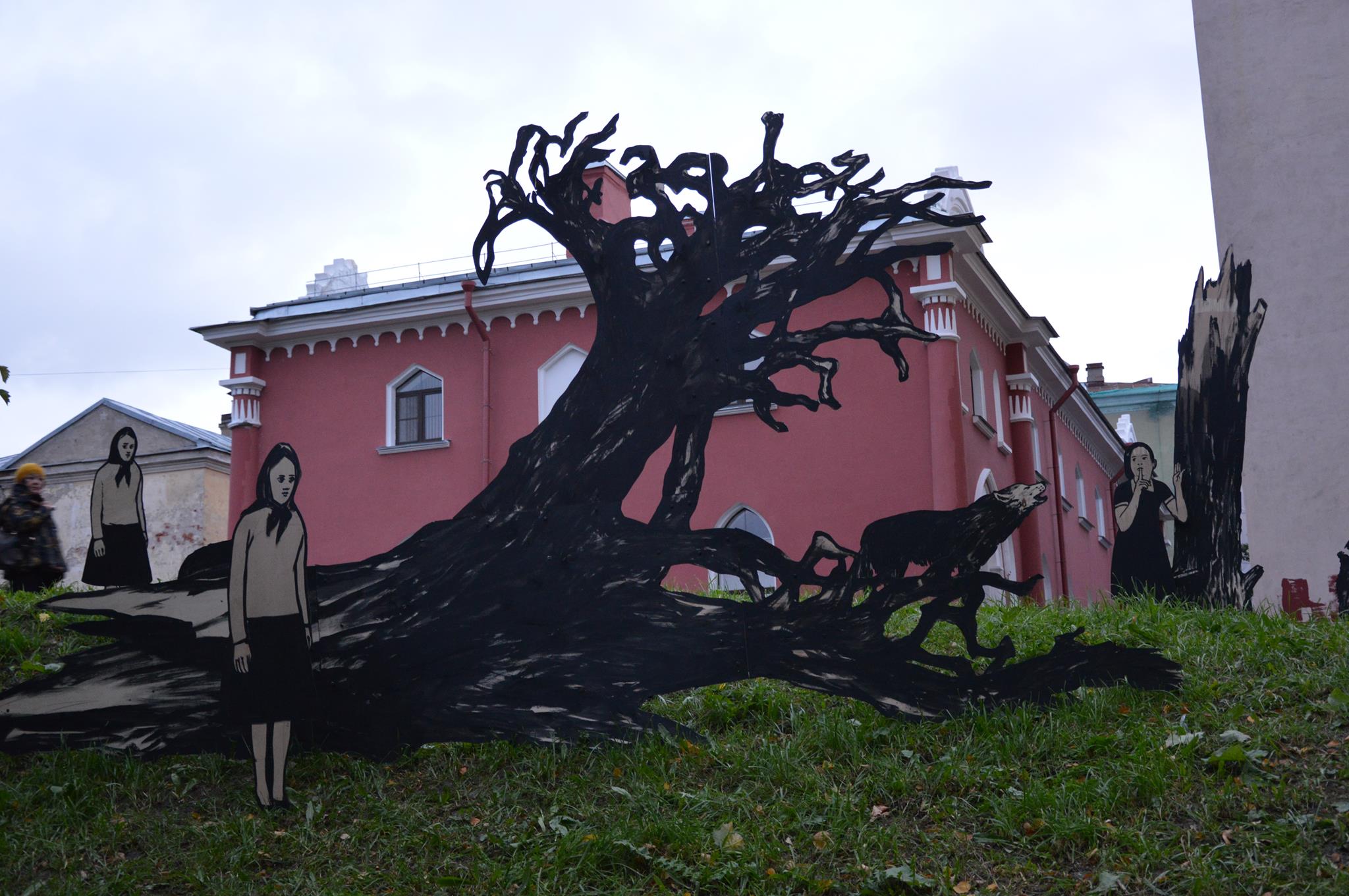 Такое же сосредоточение и погружение в среду требуется в другом её проекте, созданном совместно с Юрием Штапаковым для внутреннего сада дворца Юсупова на Мойке («Что помнят деревья»). Гуляющие слышат доносящиеся из деревьев голоса людей, рассказывающие какие-то свои истории: «живые свидетели прошлого, мирных прогулок и кровавых убийств… что они помнят и что могли бы рассказать нам?» Эти голоса невольно играют роль манка, подводя зрителя к горке на склонах и на вершине, на которой Александр Шишкин-Хокусай создал масштабную инсталляцию («Белый шум»), расставив своих безымянных фанерных героев, как стоп-кадры из фильма ужаса, разыграв драматургию происходящего как постепенно разворачивающуюся в пространстве сцену. Художник никогда не проясняет сюжет мизансцен, организованных с помощью его стаффажных персонажей. Он обыгрывает всегда некое напряжённое психическое состояние ожидания, томления, предчувствия просветления, страха, надежды или ужаса. Кочующий театр Шишкина-Хокусая в данном случае представляет эпическое действие, где нарастающий драматизм происходящего вырастает в сцену молчаливого предстояния свершившемуся. Спиленные, поваленные, вырванные с корнем деревья-силуэты, смиренные женщины в платочках, волки (или койоты, как утверждает сам художник, отсылая к Йозефу Бойсу с его шаманской ворожбой) замерли, внимая чему-то неизвестному. Это, как утверждает художник, вслушивание в тишину, в себя, возможно, даже в нанозвук, который сообщит нам Нечто, чего мы давно уже ждём.