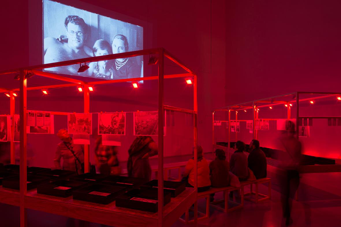 Чтобы рассказать историю жизни братьев Хенкиных и их увлечения фотографией, кураторами выставки выбран максимально театрализованный способ экспозиционной подачи. Самый большой зал в Главном штабе Эрмитажа крест-накрест разделён двумя диагоналями и превращён в подобие фотолаборатории. Одни снимки развешаны на прищепках и как будто сушатся, другие погружены в ванночки для проявки и промывки отпечатков. Но чёрные кюветы сделаны из металла и намертво прикреплены к столам – видные сквозь водяной слой лица и фигуры никак не получается оживить рябью на поверхности изображения. Всё заливающий красный свет создает ощущение напряжённости и опасности, одновременно оставляя смотрящего наедине с каждой фотографией. Помимо этого, все работы проецируются на стену зала в режиме непрерывного слайд-шоу.