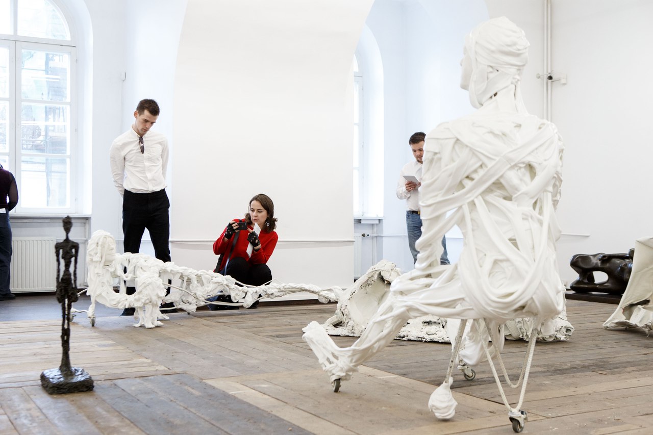 Сперва требуется простыми словами описать всё, что мы видим на трёх этажах ММОМА. На первом этаже художником Майком Нельсоном инсталлирована комната «Снова больше вещей (разрушение плиты)». Антропоморфные скульптуры из коллекции V-A-C шебуршатся на подиуме. Скульптуры Генри Мура, Альберто Джакометти, Луиз Буржуа, Константина Бранкузи соседствуют со статуэтками народов традиционных культур. Стирается классический порядок экспонирования и рефлексии по поводу искусства. В создавшемся контексте происходит взаимообмен ритуальными и художественными идеями. Хронология разрушена, иерархия упразднена. Метод презентации отсылает к антуражу мастерской, студии. Это сходство подчёркивают авторы выставки. Ведь, в отличие от музея, студия – место лабораторного проектирования, движение мысли в каждый момент изменчивой, не результат, а процесс. Вполне себе отзывчивый к предъявленному стилю «Генеральной репетиции», апологет тем гибридности, взаимодействия и постпродукции художник Габриэль Ороско говорит: «Я понимаю слово „студия” в буквальном смысле – не как место производства, а как время познания». Шершавые, экспрессивные, подчас раненые и растерзанные фигурки уподобляются на планшете актёрам. А пьеса может быть какой угодно.