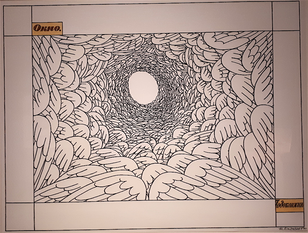 Читая эти пассажи, сразу вспоминаешь лист из альбома «Десять персонажей» (1970–1974). Тушью и пером нарисован тоннель из ангельских крыльев, открывающийся в перспективу светового окулюса. Именно так в XVII и XVIII веках создавали машинерию «облачного присутствия» божеств на сцене старинного театра, доказательство чему – листы немецких и итальянских сценографов барокко с подобными спиралями, тоннелями облаков, демонстрирующиеся на выставке «Гипноз пространства» в ГМЗ Царицыно. Перистая складчатость в обоих случаях заставляет вспомнить идеи Жиля Делёза об универсальной складчатости барочного мира, в котором лейбницская монада чревата бесконечным развёртыванием актуальных возможностей воплощения бесконечности. Той самой, что скрыта в монаде как в комнате без окон, проектном чертеже… Подобная вариативность, заряженная поисками идеала, удивительным способом сближает парадоксальные, оксюморонные щедроты барокко, «ненадёжные рассказы» романтического концептуалиста Кабакова и виртуальные пространства идентичности сегодняшней культуры…