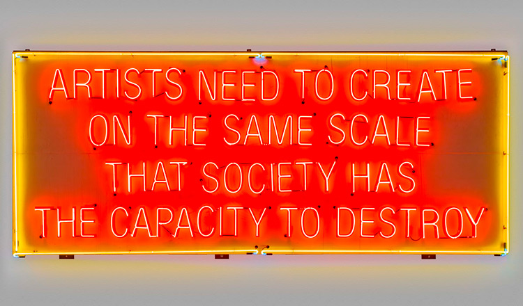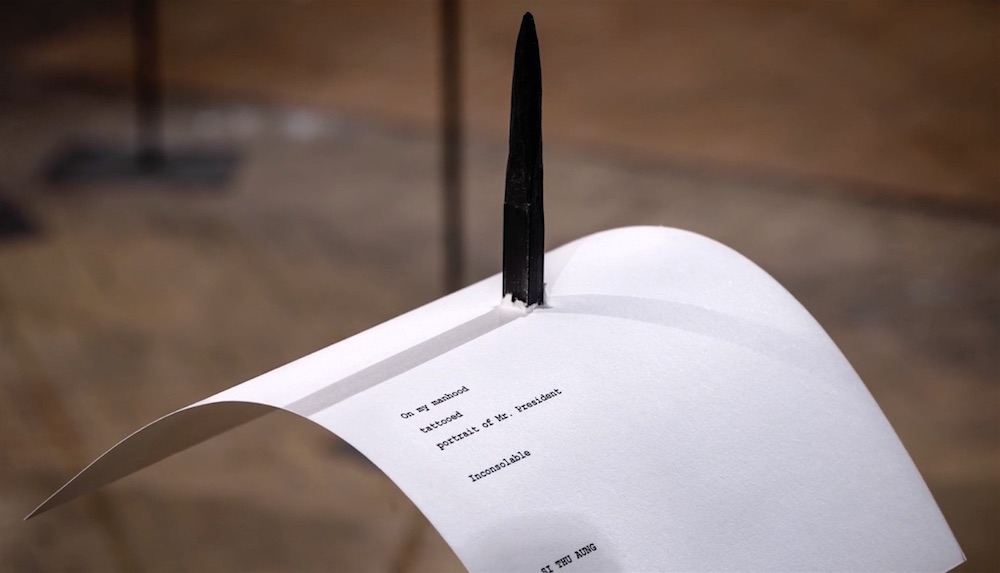 В случае с постправдой важнейшей темой является пограничная зона встречи разных истин и воль. Темам границы (этнической, политической, социальной) посвящены многие работы. Одна из лучших – саунд-арт-инсталляция индийской художницы Шилпы Гупты For, in your tongue, I cannot fit. Слова взяты из стихотворения азербайджанского поэта XIV века Имададдина Насими. В тёмном зале висят сто микрофонов. Под ними – пюпитры с обрывками фраз на разных языках, от хинди и египетского до русского. Звук в каждом из микрофонов попеременно передаётся резонансной волной в остальные. И так сто раз. Сто стихов репрессированных за свои политические взгляды поэтов от VII века до современности наполняют пространство зала, неизбежно подключая слух и чувства посетителя. Стократно усиленный звуковой пейзаж мощно втягивает в своё поле.