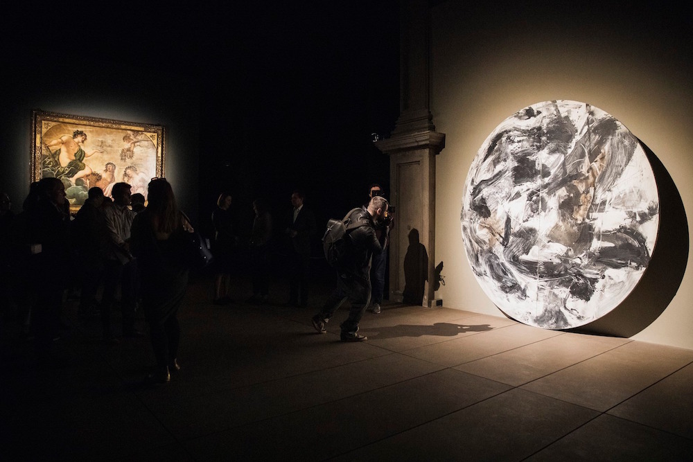 Полностью противоположной по режиссуре вышла выставка в церкви Сан-Фантин. Сценарий вроде бы схож. Только диалог создателей, ГМИИ имени Пушкина, Stella Art Foundation, кураторов Ольги Шишко, Марины Лошак ведётся с Тинторетто, чью неизвестную картину показали в церкви. Четыре мастера – режиссёр театра Дмитрий Крымов, художники Ирина Нахова, Эмилио Ведова и Гари Хилл – представляют мир Тинторетто в его движении от реального свидетельства божественного присутствия, явленности чуда (Крымов, Нахова) к чистой абстрактной виртуальности (Эмилио Ведова, Гари Хилл). По контрасту с плакатной наивностью работ мастеров русского павильона в данном проекте природа магического света Тинторетто препарируется бережно и скрупулёзно. Мы воочию убеждаемся, что в своём обращении со световой субстанцией, инсценировкой пространства как озарения, видéния (термин точно употребил итальянский историк искусств Джулио Арган) Тинторетто оказывается провозвестником мастеров contemporary art. Это подтверждает и кинематографичность его зрения, и особое, экзальтированное чувство времени. Неспроста несколько лет назад куратор 54-й Венецианской биеннале Биче Куригер назвала основной проект ILLUMInations и начала отсчёт участников с Тинторетто.