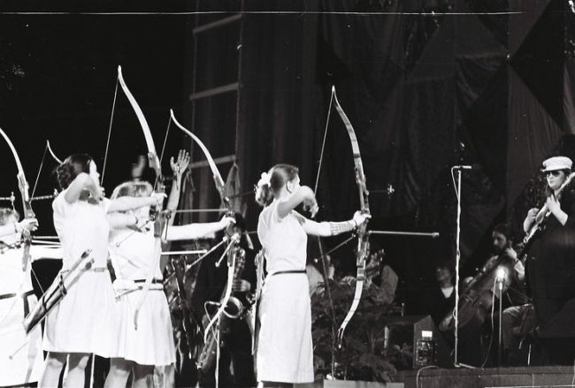 Пожалуй, наиболее яркое проявление карнавальной экстетики середины 80-х– концерты «Поп-механики», где порой на сцене могли быть задействованы даже лучницы... Фото: Лев Гончаров