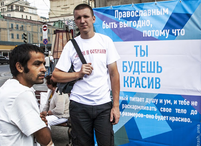 Мало того, весь этот самодеятельный «православный» креатив упал до чего-то уже вовсе тупого. Скажем, 11 июля на Триумфальной в Москве был фестиваль «Православный F.A.Q.» Понятно, радость для СМИ такое название, а имелось в виду, что там были всюду плакаты с ответами на вопрос, почему православным быть выгодно (именно – «выгодно»). Ещё там креативно представили, например, игру «Не пусти Pussy Riot в храм»: «Как рассказала представитель оргкомитета акции Александра Давыдкина, игра сделана на платформе Flash. По словам Давыдкиной, в игре "человечки в балаклавах бегут в церковь, а игрок при помощи крестика должен не пустить их в храм"».