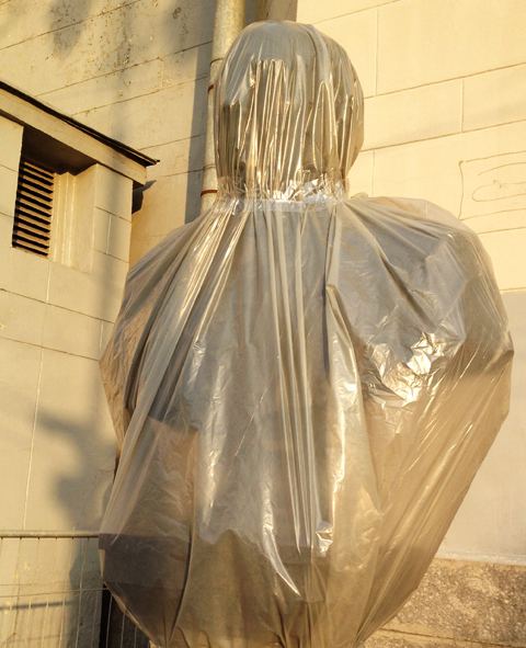 Ну а город Москва в целом живёт себе, как жил, и ставит очередные памятники неизвестно кому, зато надёжные. Этот – на углу Казанского вокзала, стоит в упаковке уже месяц.