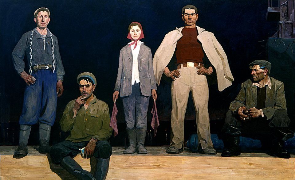 Коллажность пространства художников, обращающихся к индустриальной теме (Салахов, Дейнека, Нисский, Попков), конечно же, резонирует с построением кадра в фильмах советской оттепели и итальянского неореализма. Это фиксация состояния медитации работяг-исполинов, «матёрых человечищ», увиденных наплывом камеры для широкоформатного фильма.