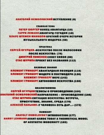Произведение, согласно Осмоловскому, предстает конкретным вещественным предметом, который обладает материальным носителем и пронизан скрытыми, но ощутимыми авангардными импульсами. Такую идею Осмоловского неплохо иллюстрируют визуальная, леттристская и конкретистская поэзия, представленная в альманахе текстами Сергея Огурцова «Искусство после философии после искусства» и Дмитрия Пименова «Сонет error». В расшифровке публичного обсуждения журнала, опубликованной на портале Openspace, Екатерина Дёготь проницательно определяет такое пафосное взыскание произведения как «прорыв в сторону радикального консерватизма». Философско-методологическом толчком для этого прорыва и его фундаментальным обоснованием служит напечатанное в первом номере сочинение немецкого ученого Гарри Леманна, последователя Николаса Лумана и Ульриха Бека; симптоматичен подзаголовок его текста – «Авангард сегодня. Теоретическая модель эстетического модерна». Предложенная Леманном формализованная схема культурной динамики от модерна к постмодернизму может быть логически оспорена и фактически опровергнута, но дело не в этом. Любопытен его финальный вывод и одновременно центральный тезис – мы живем в эпоху рефлексивного модерна (по сути, преодолевающего постмодерн), когда произведение, медиум и рефлексия (смысл) являются тремя базовыми и сбалансированными компонентами современного искусства.