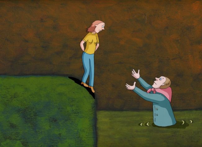 And visual metaphors can be very powerful. For instance, a husband is holding his wife; she transforms into a fish and slips out of his hands. She is not human, she is this strange creature that you cannot hold on to.