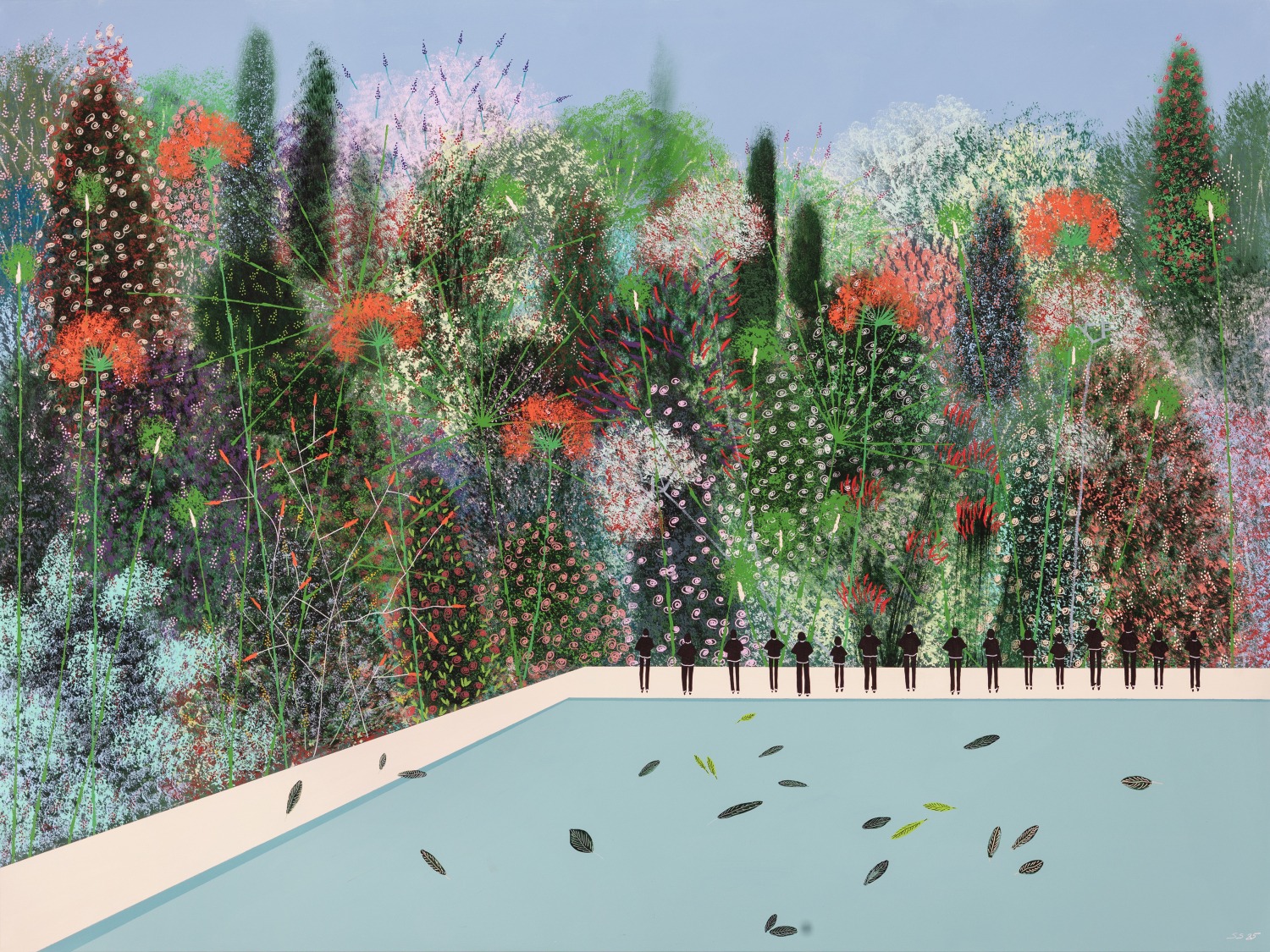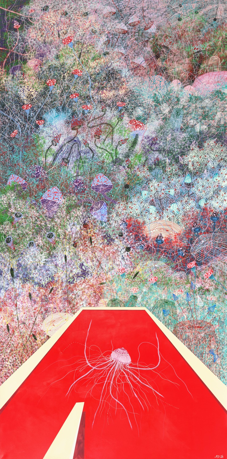 The first disturbances in this mirror were visible with the onset of the war in Ukraine nearly four years ago, when the pool turned a vivid red. Yet “The Night Before” brings a new turbulence, not only through the scale of its display. This time, the smooth surface is shattered by explosions of energy (Tsunami, 2025; Kick, 2025; Eruption, 2025). The water is no longer flawless (Leafcatchers, 2025). In another canvas, a garden gnome tries to conjure his goldfish from the pool’s depths, while a medusa drifts in a pool of blood. Would it sting if one drew too close? The solitary light in the opposite house’s window stings like the medusa – at once a promise and a rebuff. Will the door open after a knock? Or will there only be a quiet but definite refusal?