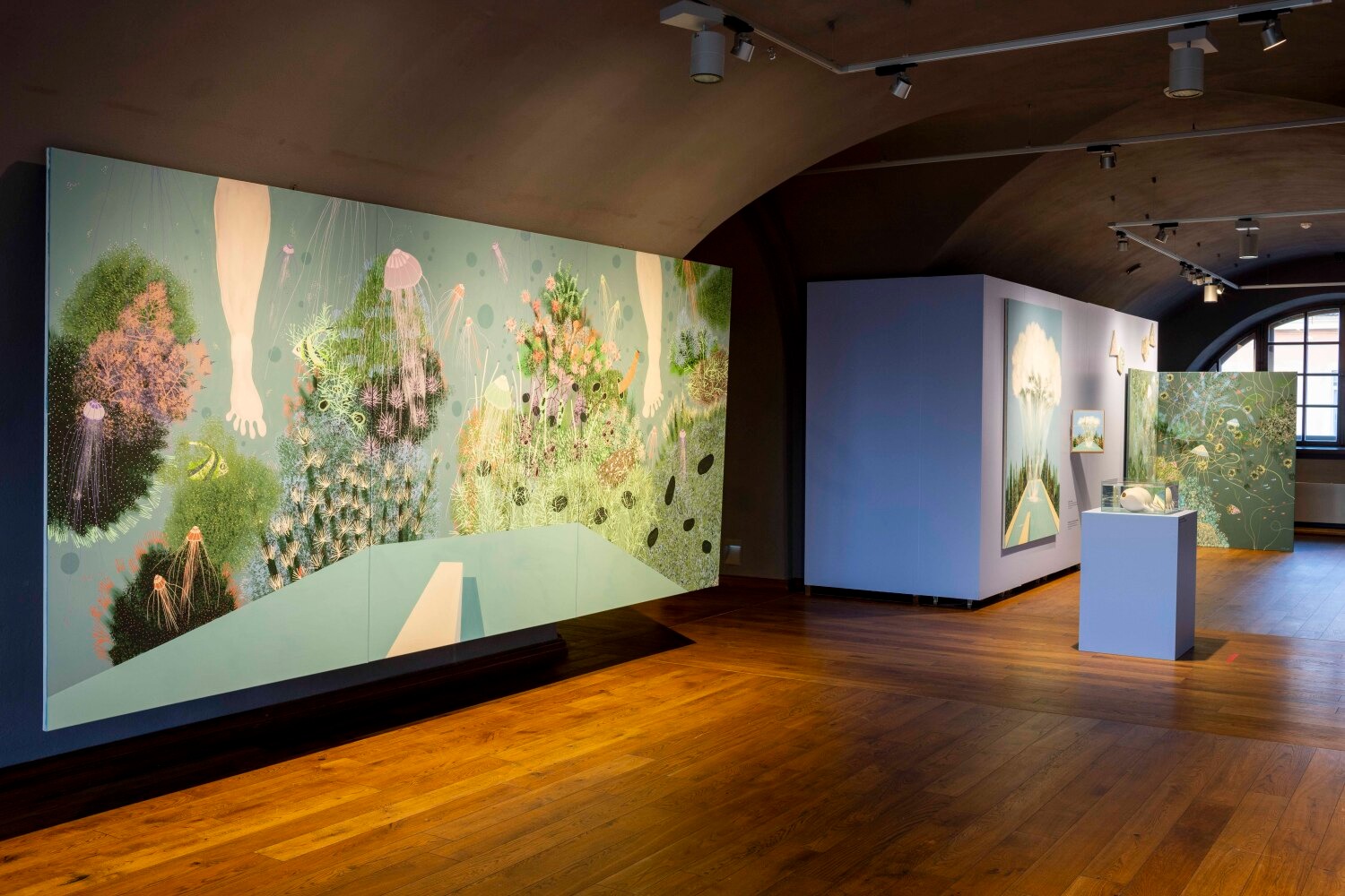 “The Night Before”, Strēle’s solo exhibition at the Rothko Museum, unfolds in the institution’s second-floor gallery space, where, acting as her own scenographer and curator, she has removed the usual modular coverings and stripped the fortress walls bare. Her monumental canvases, such as “Bleeding Medusa” and “To the Goldfish That’s Always There,” rise to more than four metres and are displayed at a tilt, like a frozen wave looming above the viewer.