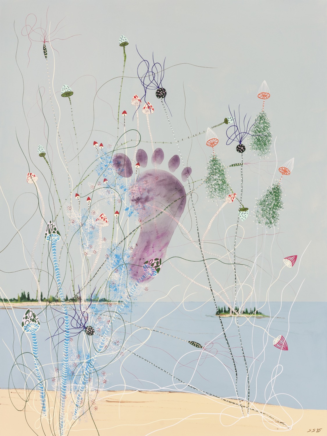 For those familiar with Strēle’s art, water has long been a central element. Until recently, it appeared as constrained, humanly tamed – most often as a smooth, silent pool. Even when overgrown in a distinctly Latvian thicket of brambles, its mirror surface was left unbroken, unruffled by so much as a stray leaf. The lack of human figures in the painted scenes did not mean the absence of a human presence – one could imagine a watchful figure just beyond the frame, carefully tending the pool.