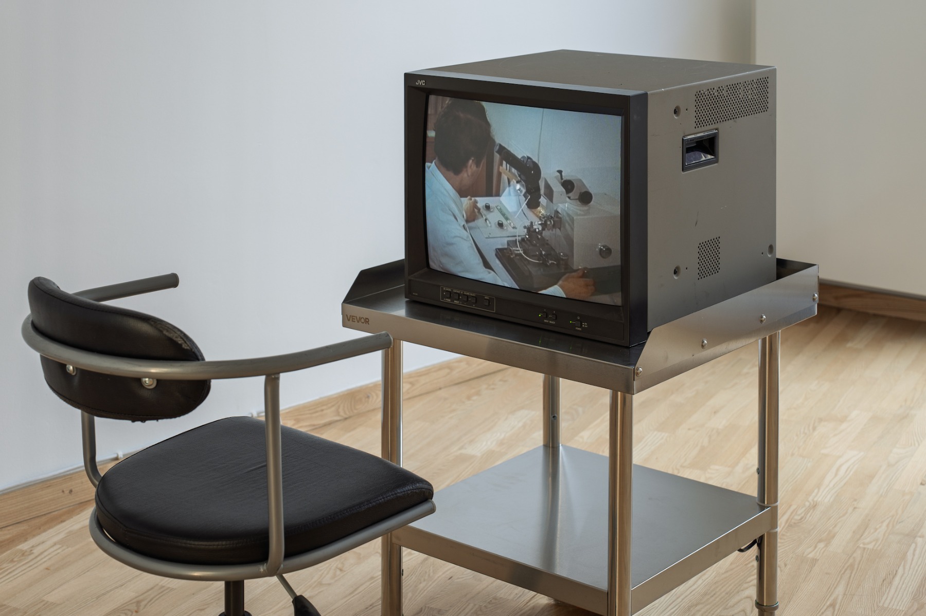 Anna Engelhardt, Mark Cinkevich, Terror Element, 2025. Single-channel video (25 min), television, camera, speakers, briefcase, explosive detection spray, laboratory tables, dimensions variable. Courtesy the artists. “Bells and Cannons”, Contemporary Art Centre, 2025. Photographer: Andrej Vasilenko
