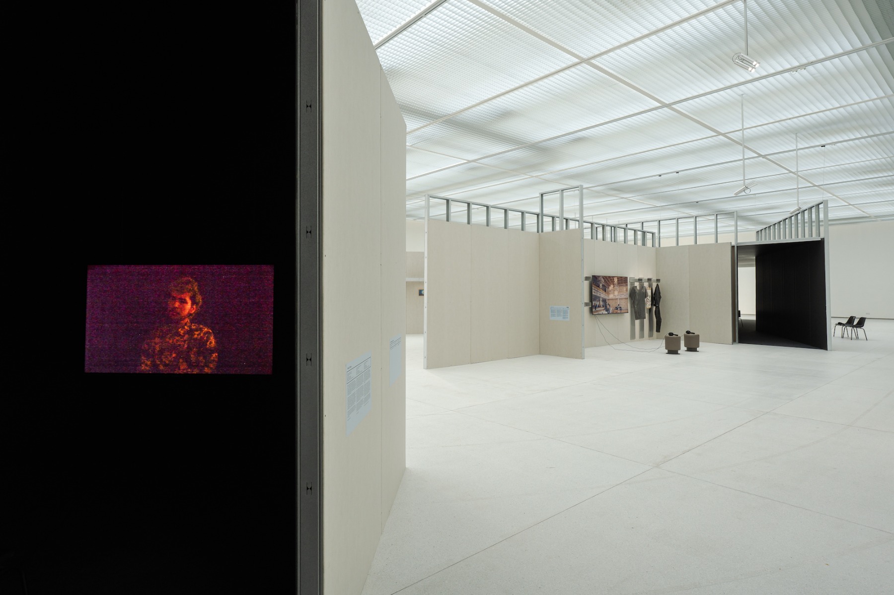 Tobias Zielony, “How to Make a Fire Without Smoke”, 2025. HD video, colour, sound (21 min 9 sec). Courtesy the artist. In the background - Henrike Naumann, “Breathe”, 2023. Coat rack, two stools, textiles, ceramics, ears of corn, chain gloves and shirt, monitor and video, dimensions variable. Courtesy the artist. “Bells and Cannons”, Contemporary Art Centre, 2025. Photographer: Andrej Vasilenko