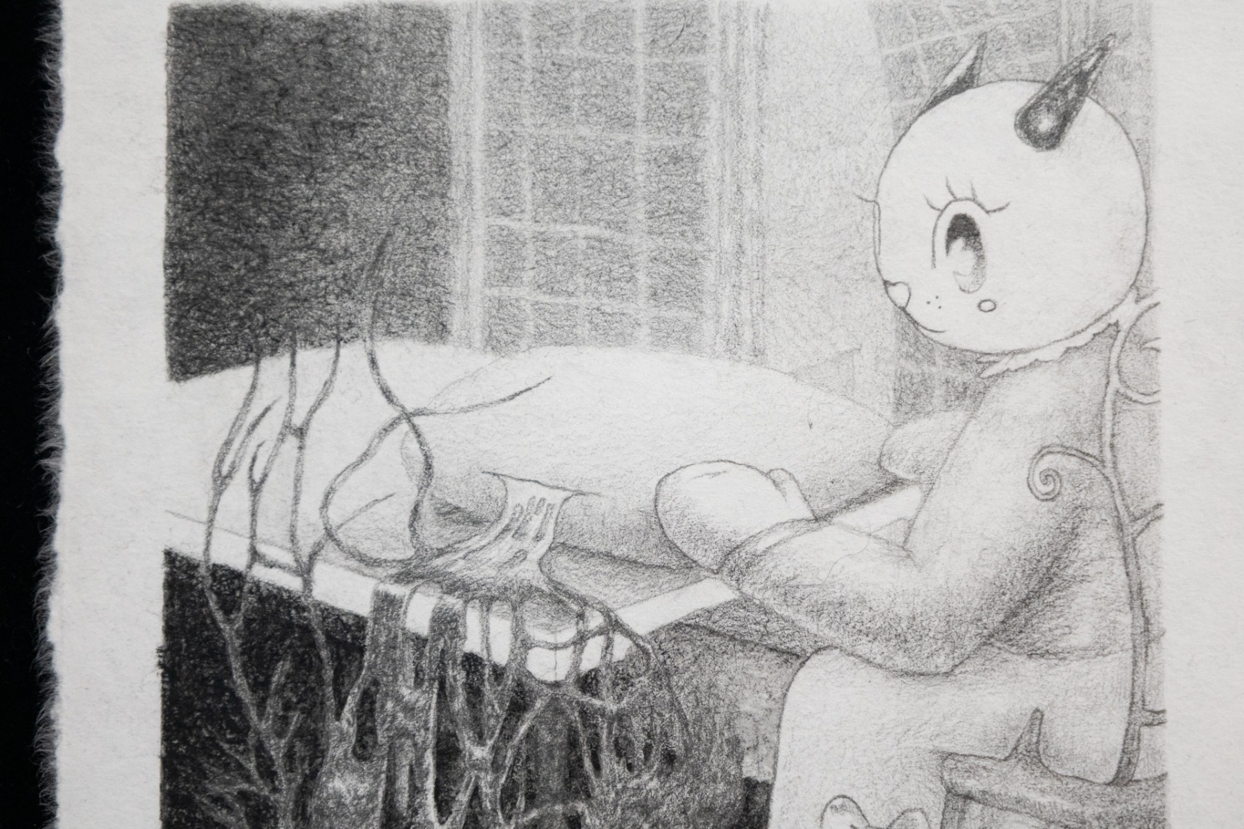 Two rooms of DOM Gallery are filled with a homey world you have created using drawings, video, small figurines and even a space where visitors can make their own drawings. You have also chosen to show sketches alongside finished works. Could you tell us about the theme of the exhibition and how it all came together?