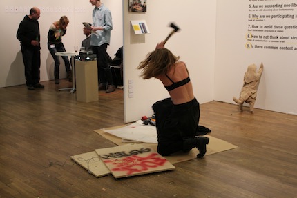 Sudden performance: a woman destroys inscription “Fuck The System”, Galleria Rajatila (Tampere, Finland)