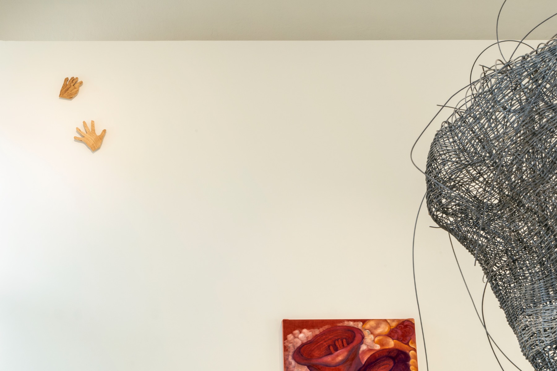 The ongoing “collection” grew, and I tried to make one more exercise out of it by revisiting it. I devised three groups or themes on which the drawings reflected: the human body, living nature, and the funny ones relating to living nature. I chose four works relating to bodily aspects from this ongoing “collection” for the show. They are framing fragments, closeups, and body sensual translations and describe the drawings of a fragile cage of ribs housing the pulsating hook of a heart with towering red juicy lips.