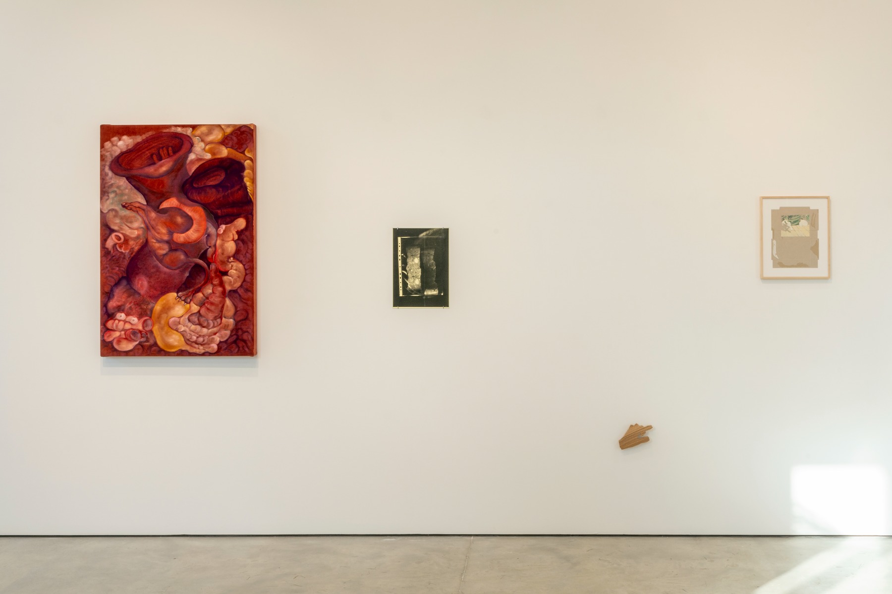 Simultaneously, I had started painting and drawing patterns of mold with pastel on the fake pieces of schnitzels, and other meats that were strewn around the digesting intestine. Over time this led me to a practice of pastel painting on velvet. The paintings Breathing a Hurricane and Just a Kidney Obsessed with Death (2024) capture a felt sense of my organs, and the visions that follow from a practice of letting go of rational thinking by diving into the body’s own intelligence. It felt natural to turn to Kasia Fudakowski next, who is one of my favourite artistic sparring partners in conversation and collaboration. In Kasia’s own words, she has a ‘don’t ask, don’t tell’ relationship with her body—an approach very different from mine. I simply wanted to see how she would continue the conversation.”