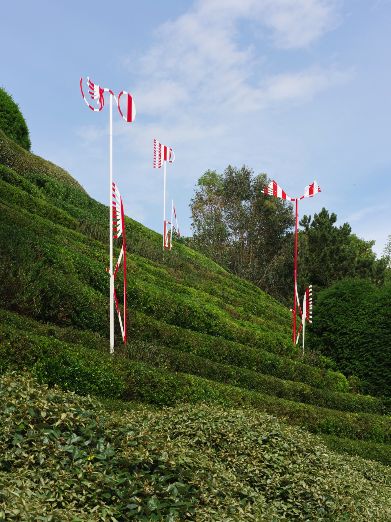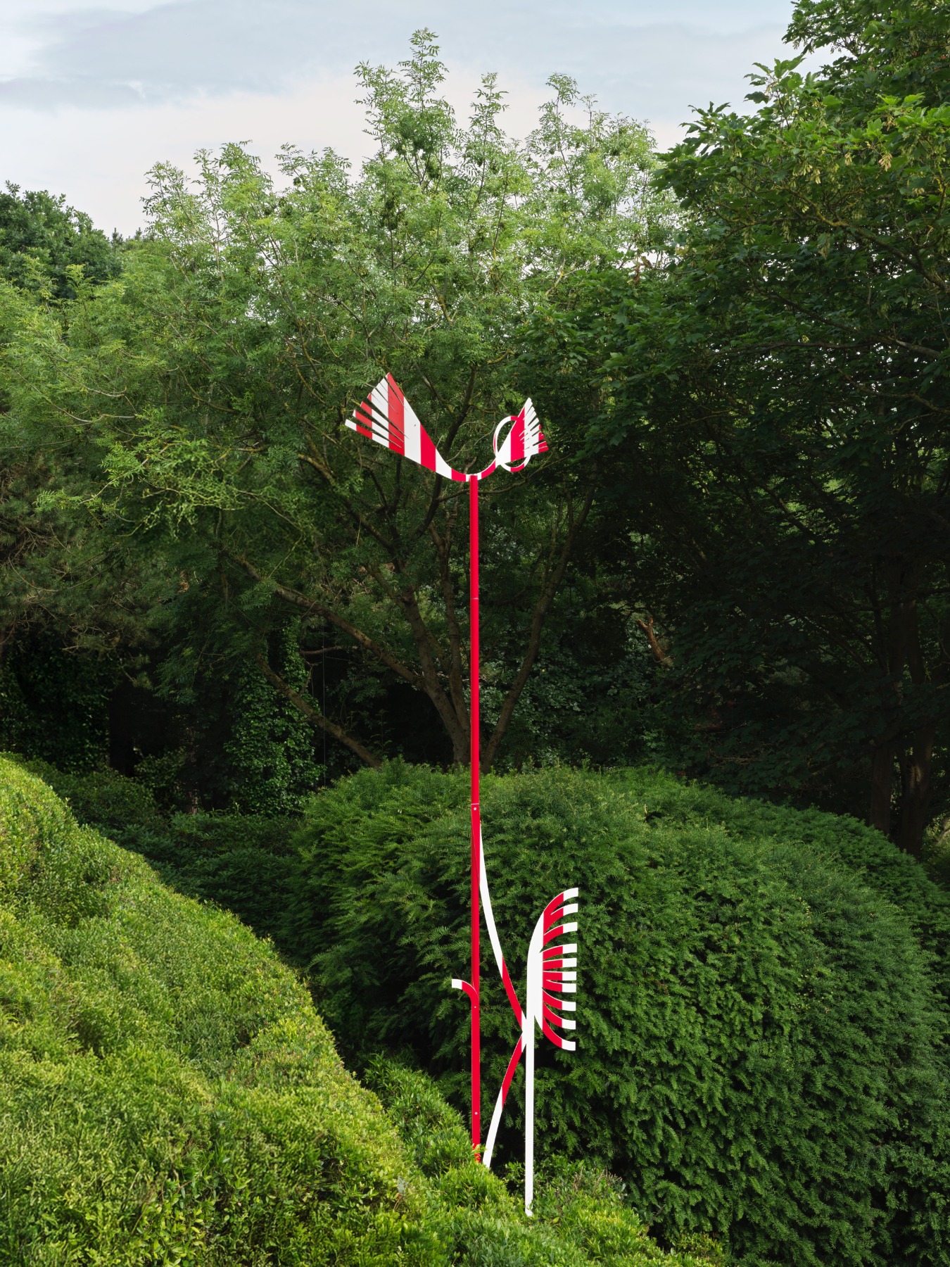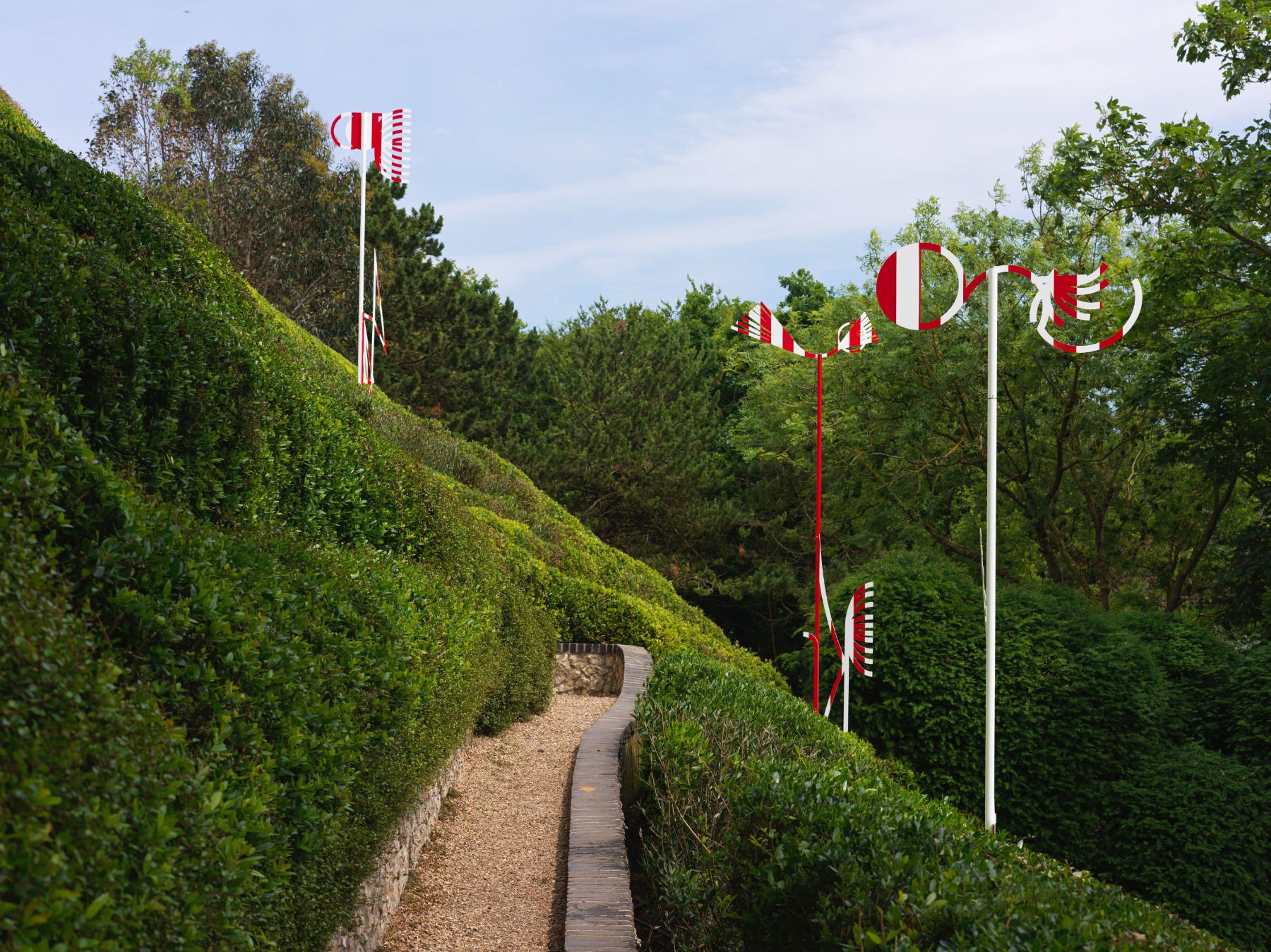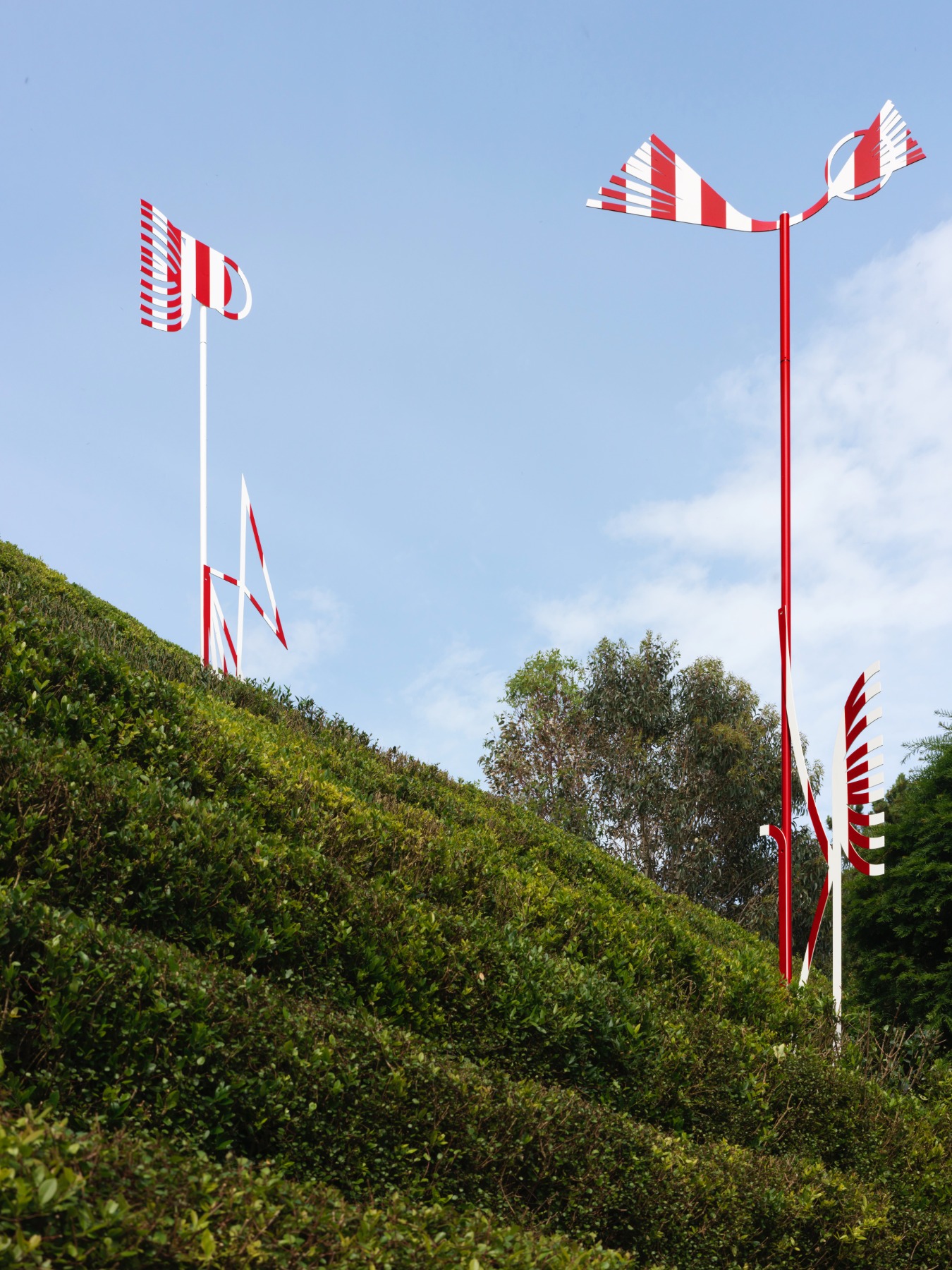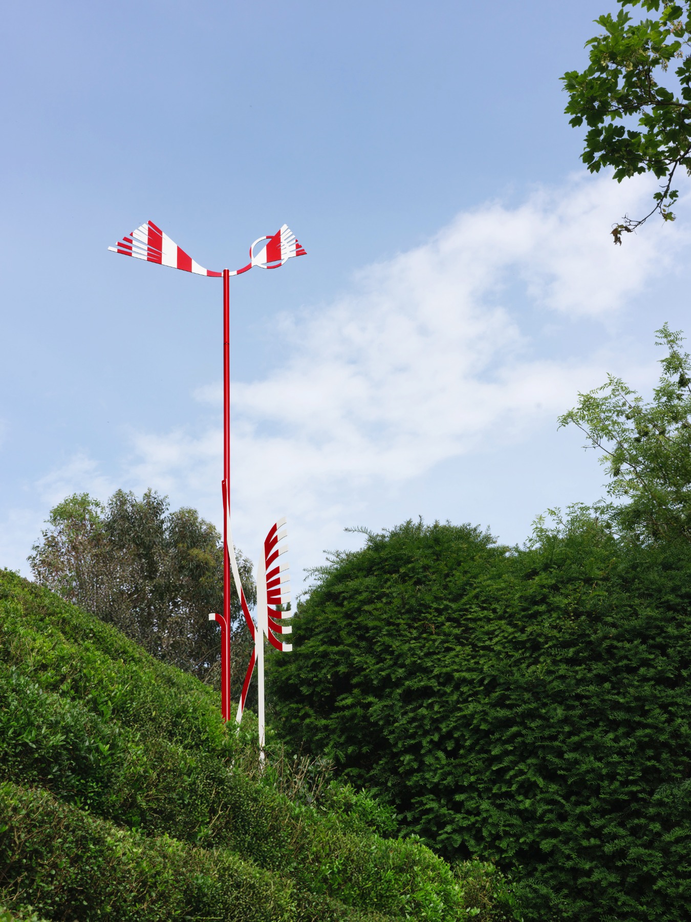 Their vertical stripes evoke both a signalling code and the naval camouflage known as razzle-dazzle that create a visually disorienting effect. These patterns disrupt perception, an effect that intensifies as the wind adds complexity to their movement. The vertical stripes are rendered in a deep, rich red known as “oxblood red”, creating a sharp contrast with the surrounding vegetation and allowing the sculptures to stand out clearly in the landscape.
