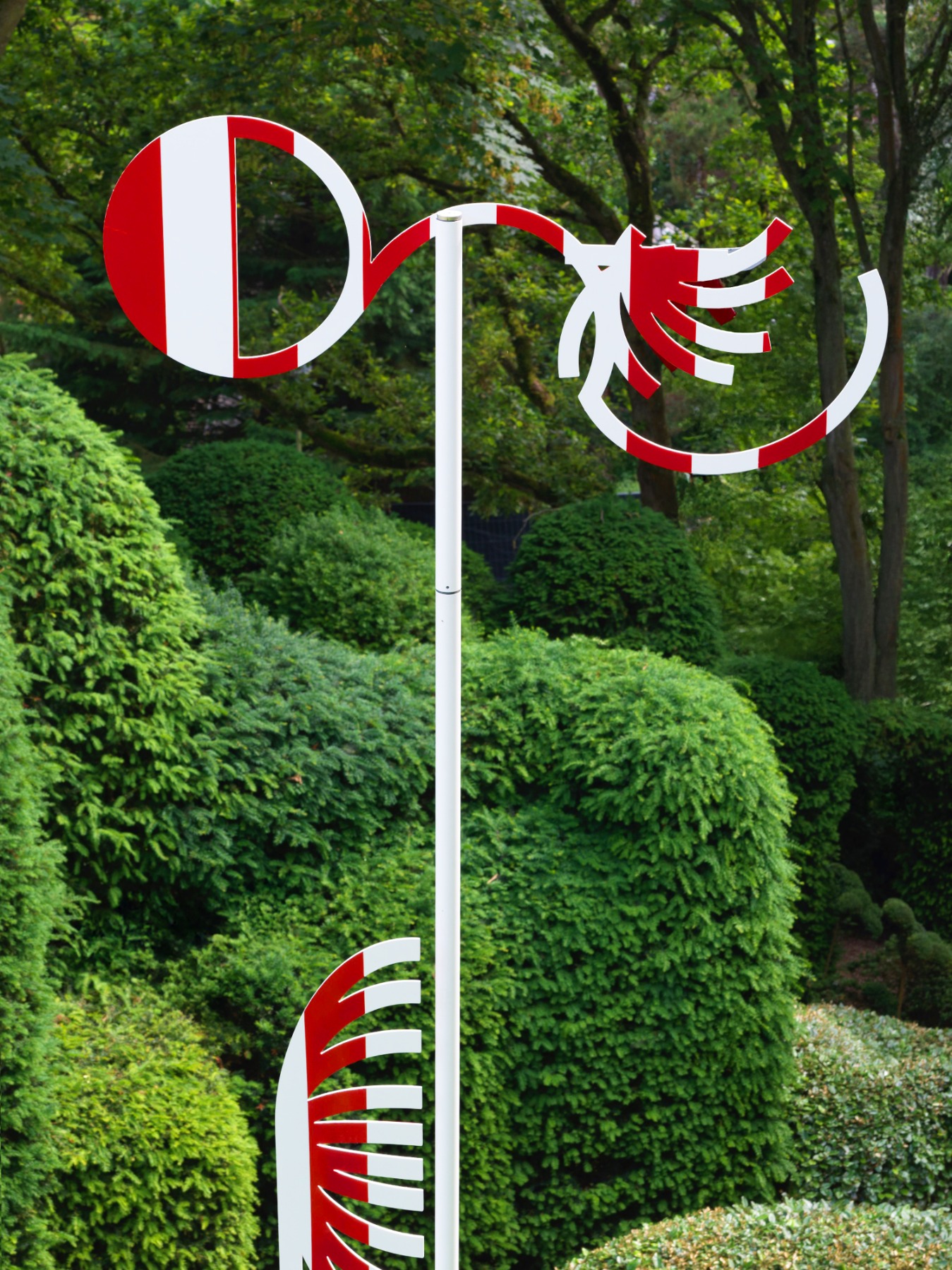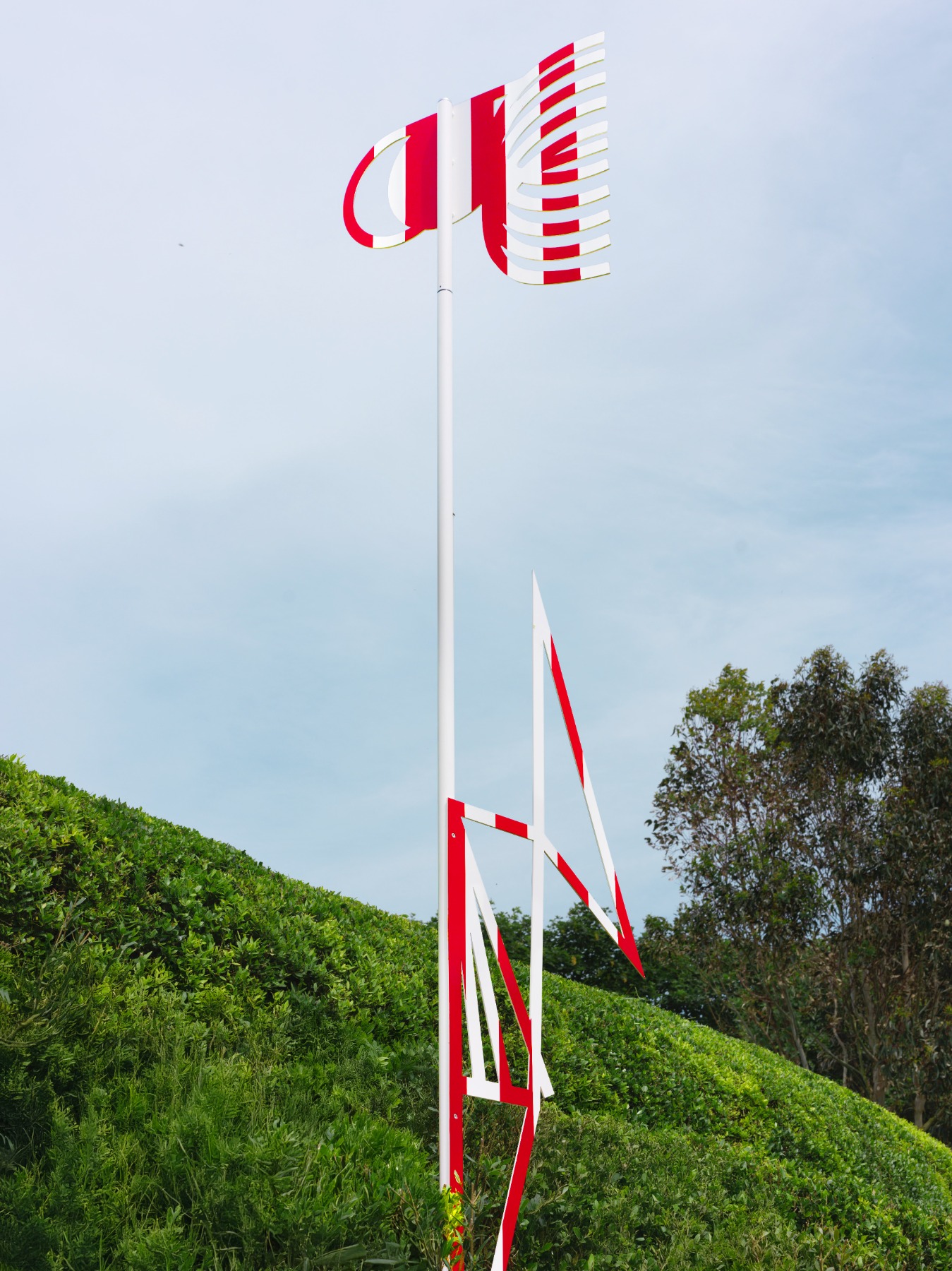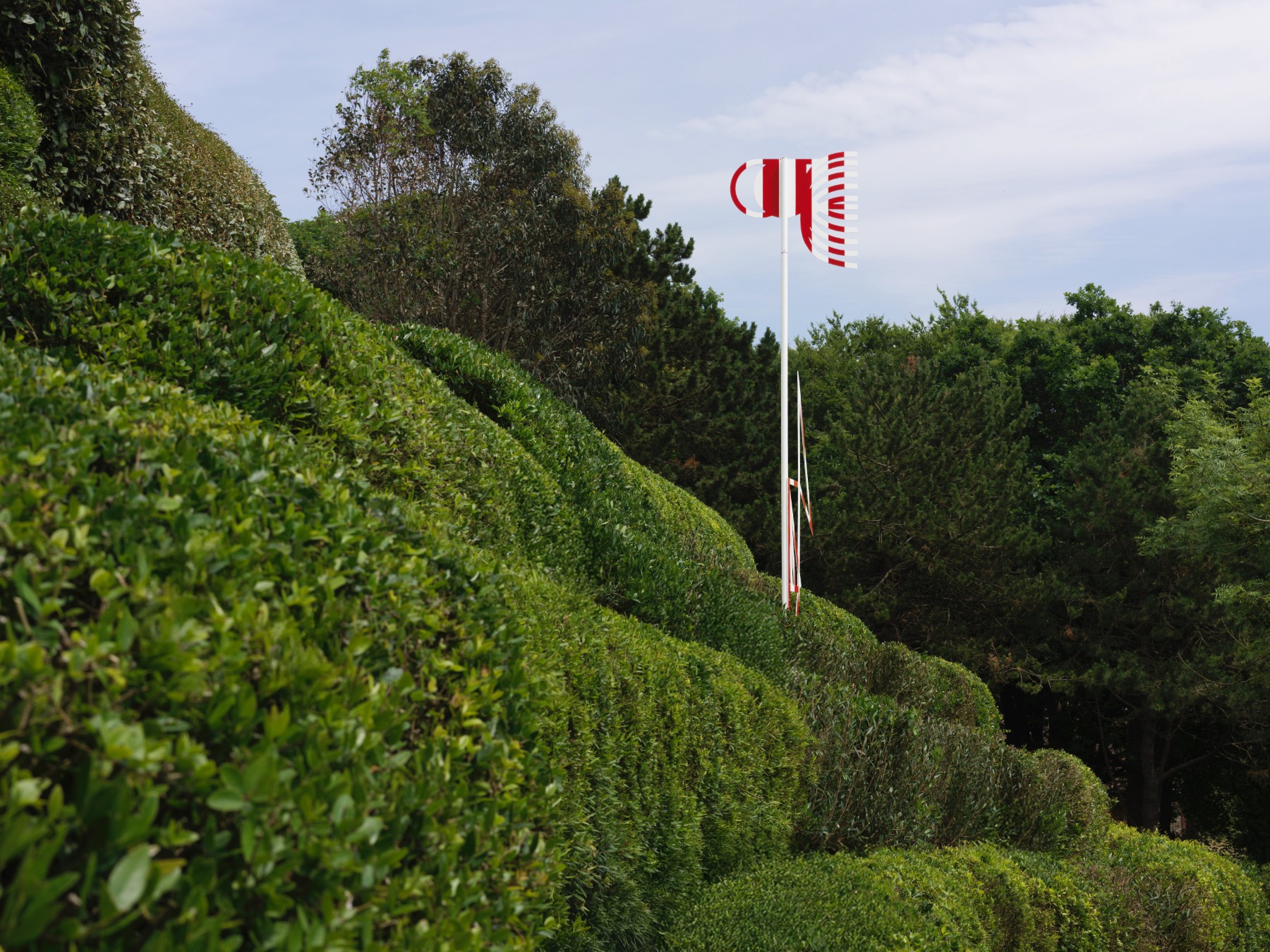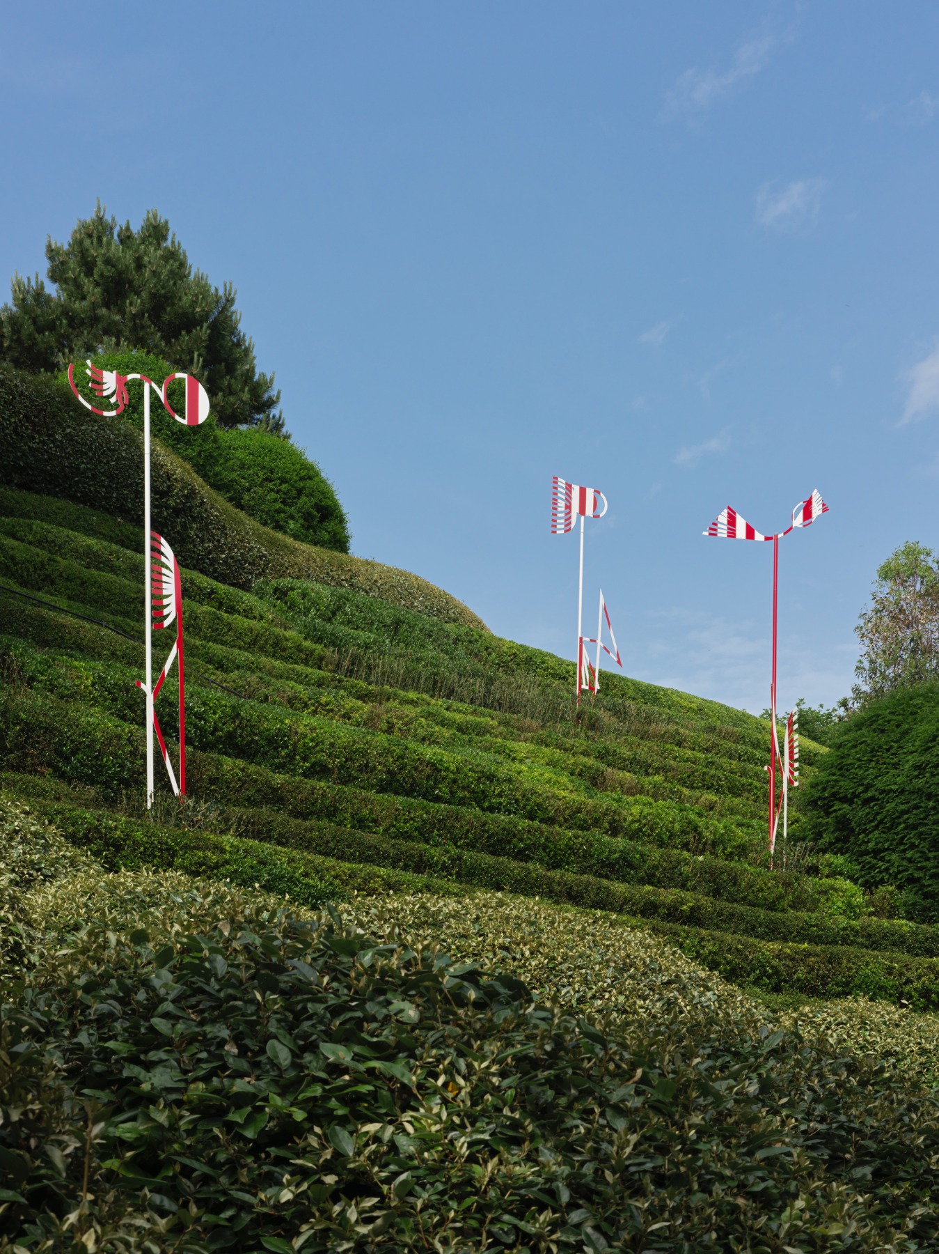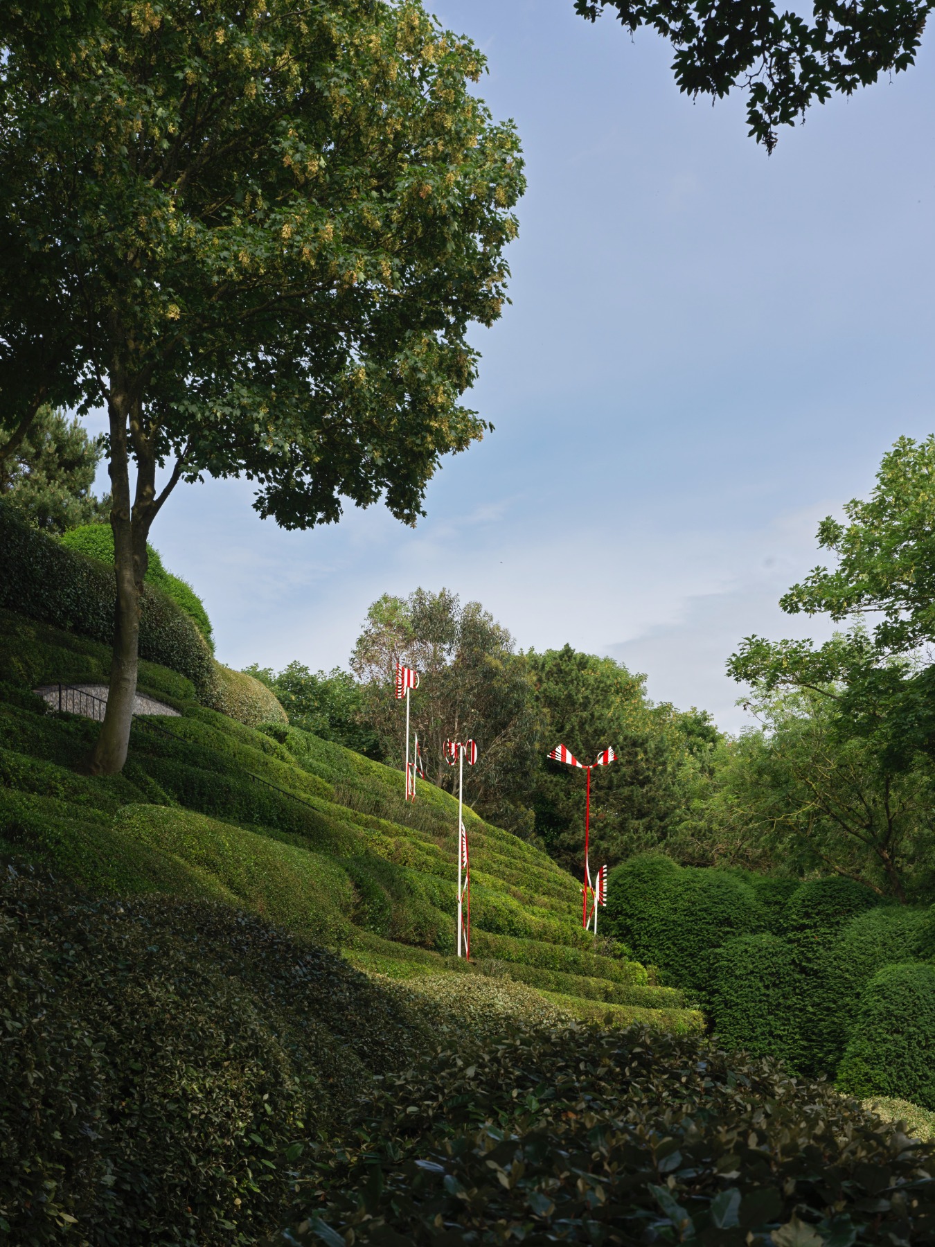 Their vertical stripes evoke both a signalling code and the naval camouflage known as razzle-dazzle that create a visually disorienting effect. These patterns disrupt perception, an effect that intensifies as the wind adds complexity to their movement. The vertical stripes are rendered in a deep, rich red known as “oxblood red”, creating a sharp contrast with the surrounding vegetation and allowing the sculptures to stand out clearly in the landscape.