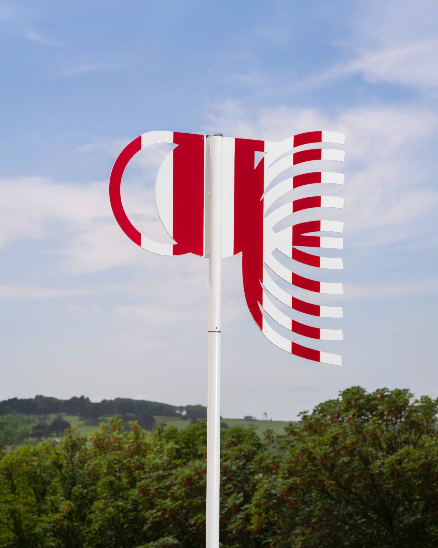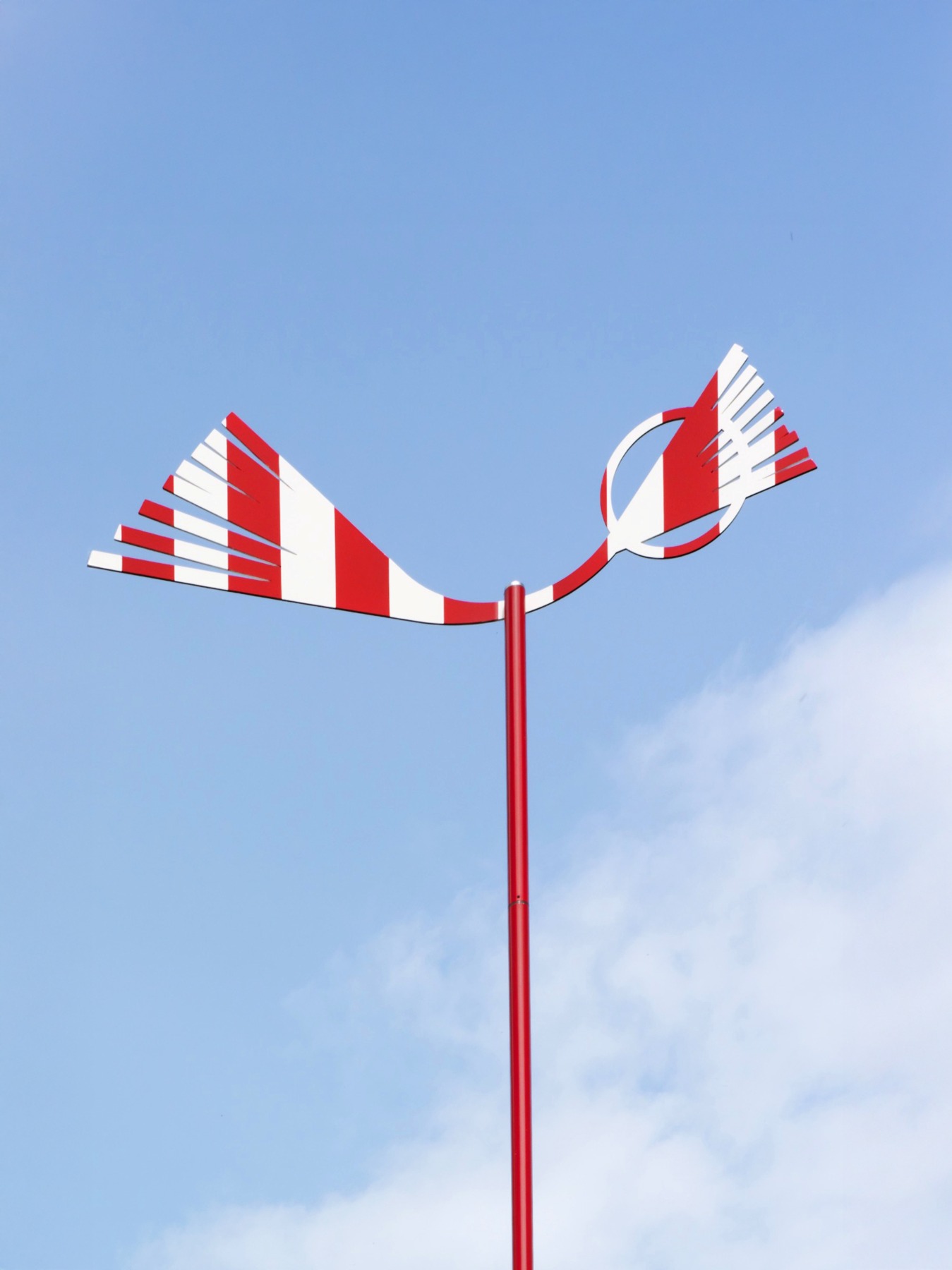 The sculptures take inspiration from the principle of the weather vane, a clear reference to traditional Norman models, reinterpreted in a contemporary form that shifts between figuration and abstraction. What makes them unique is their transformation: seemingly flat when still, they reveal their volume as soon as the wind sets them in motion, evolving from two-dimensional shapes into three-dimensional, moving structures.