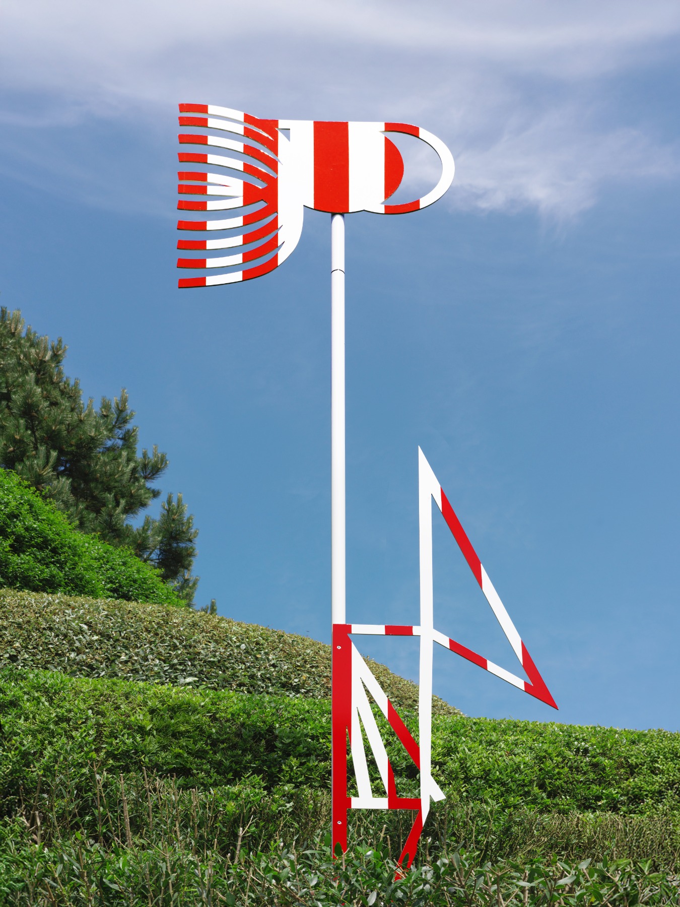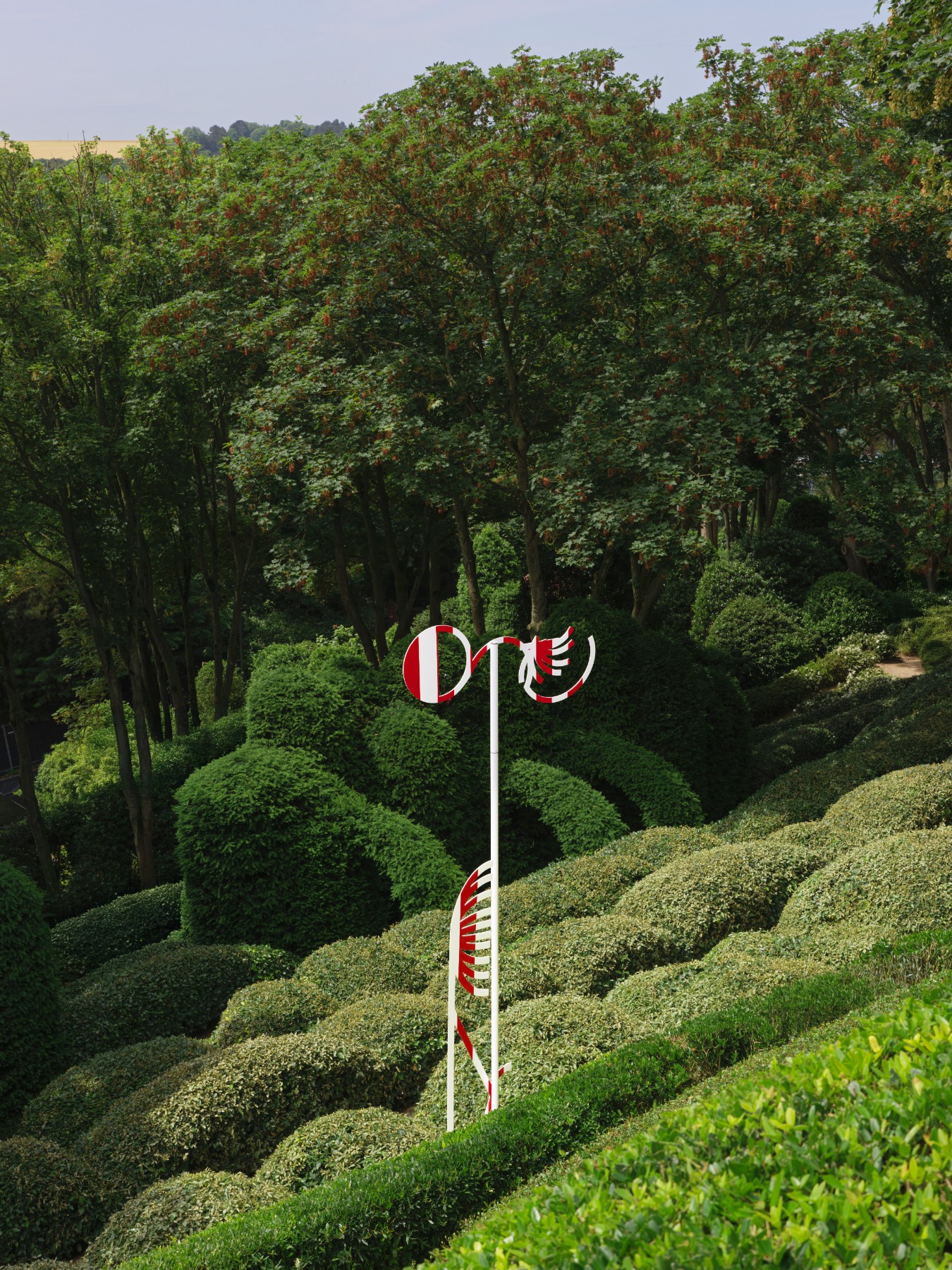 Kamil Bouzoubaa-Grivel presents a series of three mobile sculptures in painted aluminum at the Jardins d’Étretat, titled razzle d’oiseaux (1–3). These works were created specifically for this site. Inspired by the birds inhabiting the site and the ever-present wind that animates the landscape, these works reflect the spirit of motion and transformation at the Gardens. Curator: Anastasia Kharchenko.