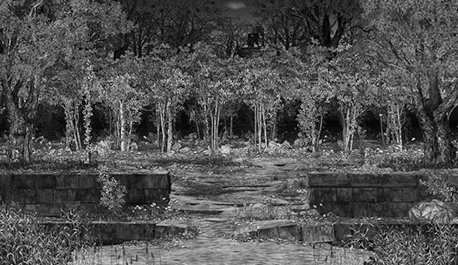 Of course, not all of the artists speak about socialism's reliquaries, but the proportion who do is surprising. The Latvian participants in the exhibition have chosen to portray different aspects of “darkness”. Katrīna Sauškina's short-film, “Memories and the Speed of Forgetting”, is a story about choosing the right road, and the answers given by characters that inhabit dark peripheries, such as fortune tellers, magicians and soothsayers, and even passionate preachers. For her part, Kate Krolle studies the aesthetics, characters and mechanisms of fear employed by horror films, as seen in her work “Dreaming Wolves. Unknown Pleasures”. The dividing walls of the smallish room are painted with a dark forest of birch trees, among whose naked trunks appears an intermittent video projection of a girl with long hair; she frantically searches for something, and then encounters something in the woods.
