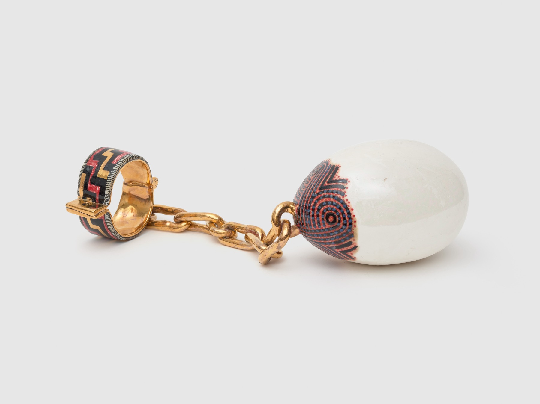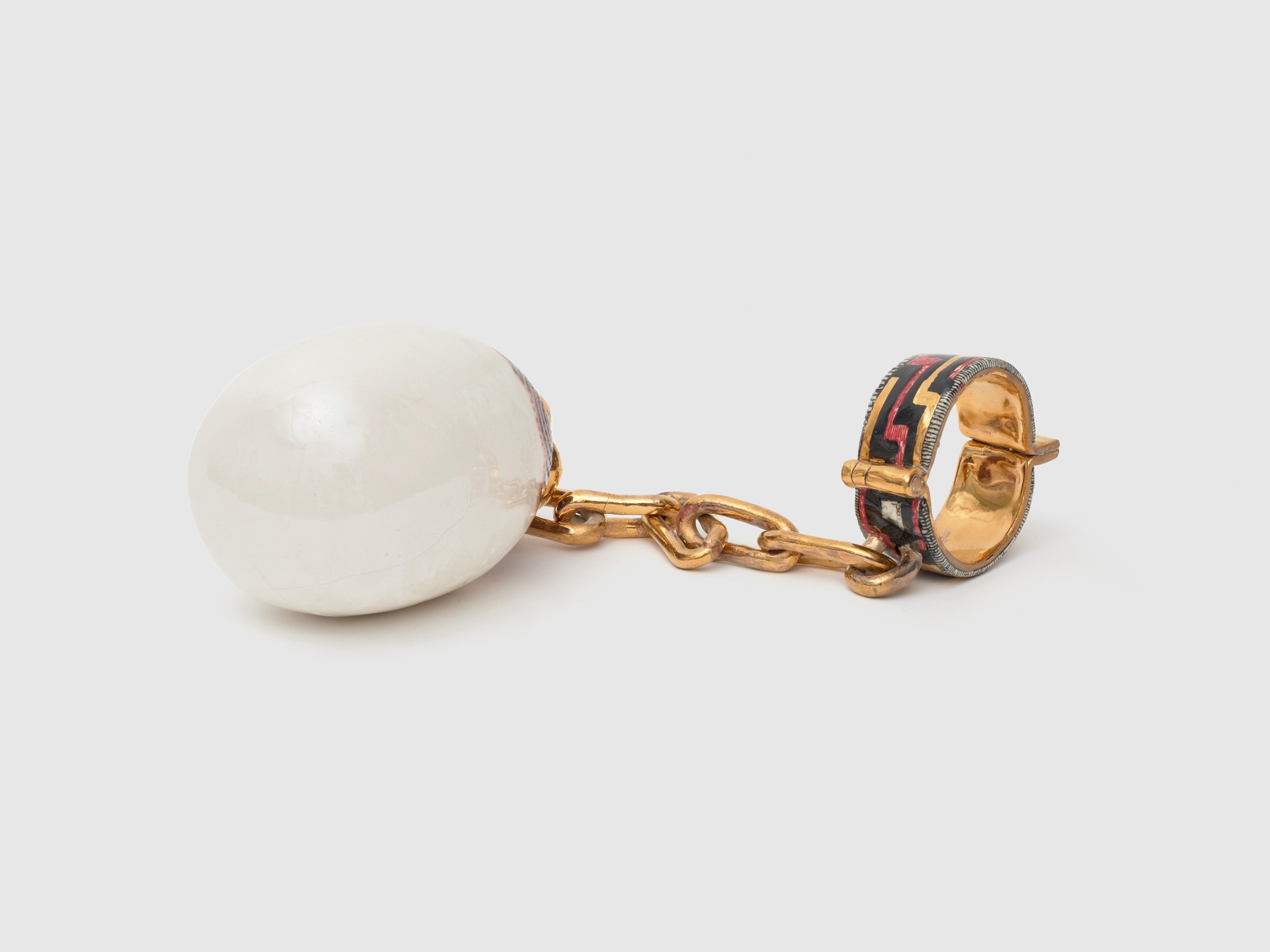 In this show, Layton’s works are all two-dimensional, and Skuja Braden’s are mostly three-dimensional, except for two wall pieces. I wanted to create groupings that flowed harmoniously—so in the back room I built a table grouping the cream-ground vessels with bright colors together. I also placed some of Skuja Braden’s more overtly political works, like the egg and chain pieces and figures that look like they’re screaming or crying, near Layton’s King Lear drawing. Those works connect really strongly.