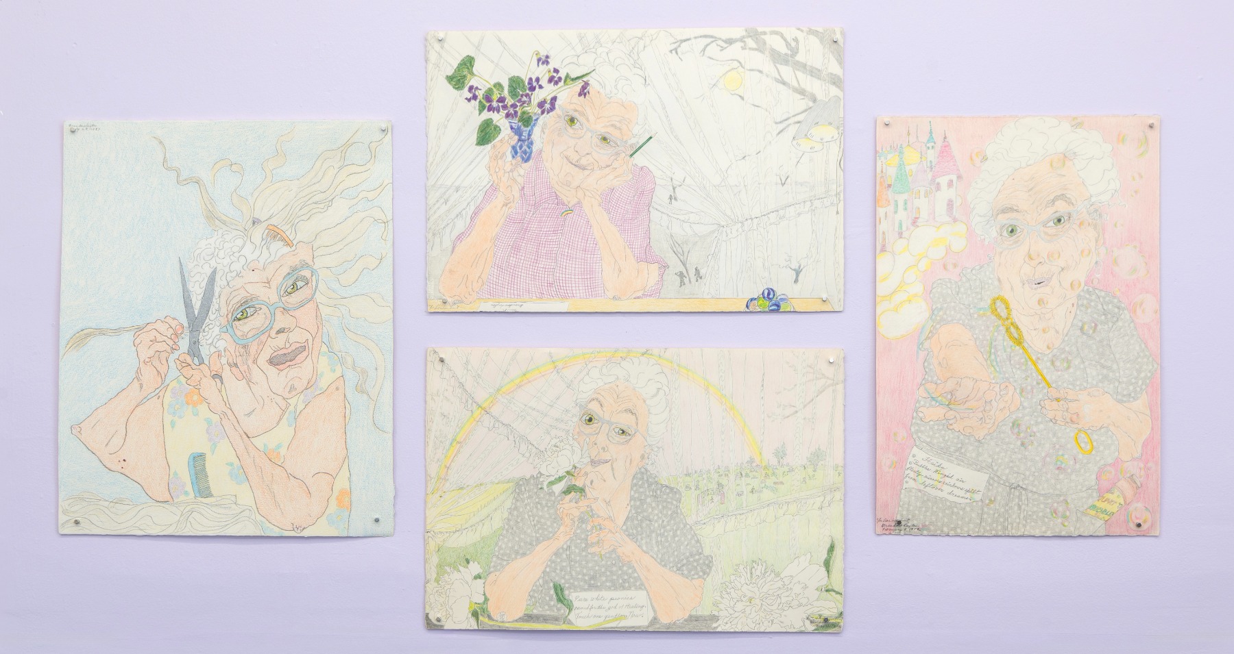 For this exhibition, Buttles brings together Elizabeth “Grandma” Layton (1909–1993) and the collaborative duo Skuja Braden. Though still largely unknown in the Baltics, Layton is an important late-20th-century American draughtswoman. After a lifetime of depression and personal upheaval, she began making self-portraits at the age of sixty-eight, developing a distinctive method of continuous contour drawing. With a single, unbroken line—often in colored pencil—she charted aging, grief, racism, misogyny, state violence, and care work with unsparing clarity. Journalist Don Lambert first championed her work in 1978, yet for years institutions condescended to it as “art therapy,” misreading emotional precision as naivety.