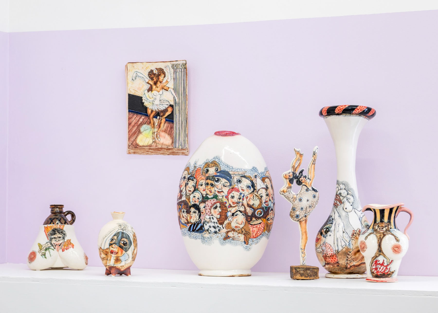 Skuja Braden—the long-term collaboration of Ingūna Skuja and Melissa Braden, who represented Latvia at the 59th Venice Biennale—work through porcelain. Their sculptures are vessels that function as bodies: sites of memory, desire, protest, humor, and care. Drawn imagery, over- and underglaze painting, and luster fuse surface and form into dense narratives of embodiment, sexuality, politics, and compassion. In their case, technical mastery and visual richness have often been used against them: dismissed as “decorative,” “kitsch,” or “too emotional” within conservative institutional frameworks, as if skill and seriousness could not coexist.