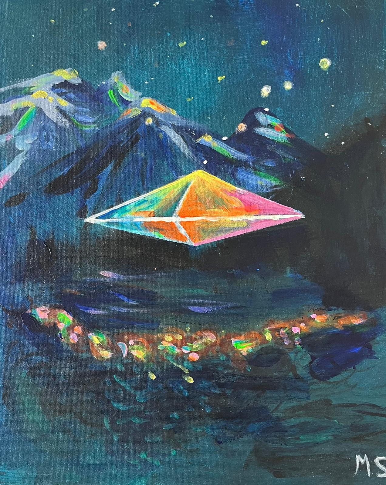 “Kosmiskā odiseja, ko uzdrošinājos izlikt apskatei, tapusi sadarbībā ar akrila gleznošanas kursu vadītāju, gleznotāju Ingu Jurovu. Paralēli rakstīšanai radās vēlme veidot ko spilgtu un sirreālu – un kas gan var būt vēl neapjaustāks un noslēpumaināks par kosmosu? Habla un Džeimsa Veba teleskopu attēlos gūtās idejas apvienoju ar tām, kas nāca no manas zemapziņas. Profesionālā gleznotāja mani atbalstīja un ieteica labākos risinājumus, kā panākt, lai galaktikas, planētas un kosmiskie virpuļi atdzīvojas zem manas otas, kuru pirmoreiz rokās paņēmu tikai pirms gada.”