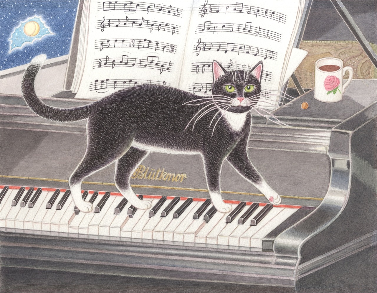 Māksliniecei doma par izstādi Liepājas muzejā radās, klausoties “Kaķīša rudens murrā dziesmiņu”, domājot par mīļajiem autoriem, kuru grāmatas viņa ir ilustrējusi, un gaidot rakstnieces Ineses Zanderes dzejoļu grāmatu “Kaķa vijole”, kas drīzumā iznāks izdevniecībā “Liels un mazs”.