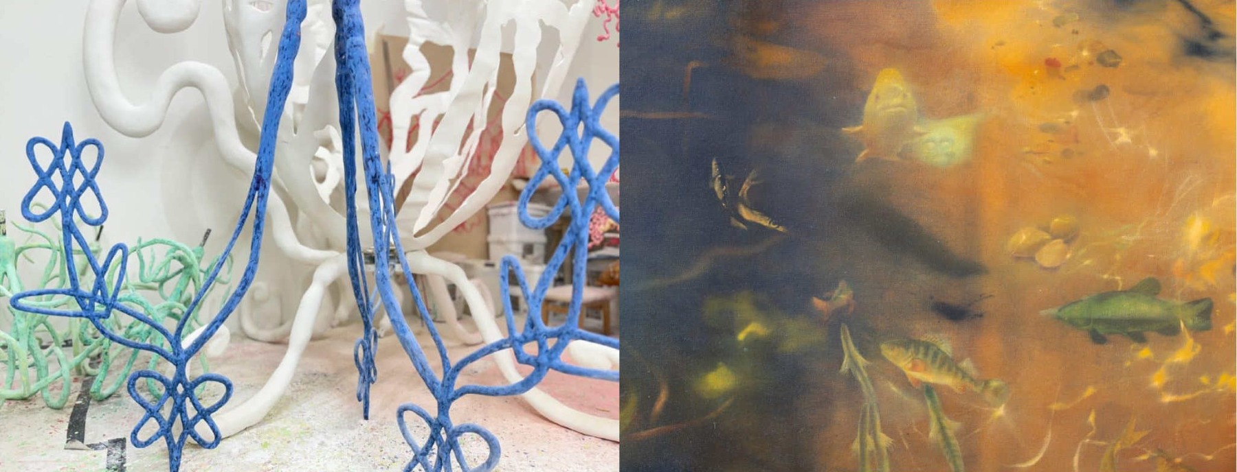 Annas Egles ekofeminismā balstītā tēlniecības prakse aplūko radošo darbību kā garīgu ceļu, savukārt Ievas Putniņas glezniecība, balansējot starp sirreālismu un hiperrealitāti, pēta dabas, materiālu un ikdienas novērojumu transformācijas vizuāli piesātinātos tēlos. Abu mākslinieču darbi izstādē savijas vienotā, simboliski strukturētā pieredzē.