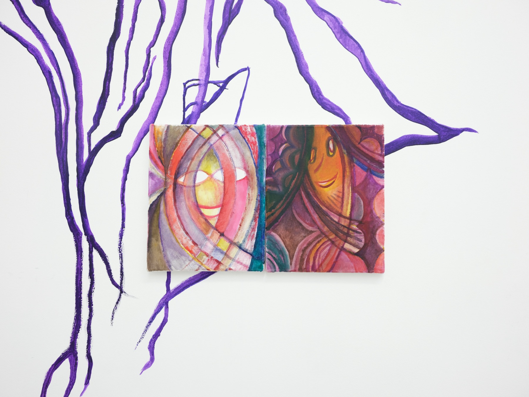 Gleznas ir izteikti krāsainas, to tēli reducēti līdz grafiskām smaidošu seju formām, kas nedaudz atgādina ikoniskos emodži uz psihedēliskajām tabletēm no 2000. gadiem. Bet, protams, iespējams meklēt arī saikni ar senākiem kultūras slāņiem. “Groševa gleznas atsaucas uz 20. gadsimta sākuma mēģinājumiem radīt garīgo gramatiku, izmantojot deformāciju, hromatisku pārmērību un ritmiskus rakstus. Ja abstrakcija reiz solīja transcendenci caur formālu saskaņotību, Groševs inscenē situāciju, kur sakārtotība pārtop apofēnijā – tieksmē saskatīt struktūru tur, kur tās, iespējams, nemaz nav.” Vēl viena svarīga detaļa: “Groševs dzimis 1983. gadā. Tomēr vairākus gadus viņa Facebook profilā kā dzimšanas gads bija norādīts 1913. Joks dzīvoja līdz mirklim, kad kļuva bioloģiski neticams. Tomēr šis žests joprojām rezonē. Kaspara Groševa personālizstāde Feedback uztver laiku kā signālu, kas nepārtraukti cilpo atpakaļ pie sevis. Izstādes darbos vienlaikus jūtams gan kaut kas novēlots, gan kaut kas vēl tikai gaidāms.”
