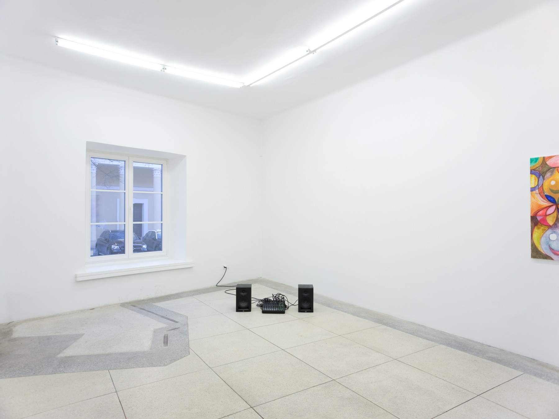 Skaņas instalācija cilpo un kropļojas – tā ir kā stereoīdus saēdusies feedback cilpa. Kā tā sasaistās ar gleznām? Vai mums vispirms vajadzētu klausīties un pēc tam skatīties, vai secībai nav nozīmes?