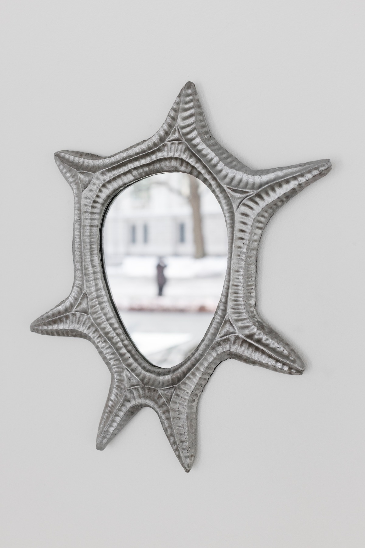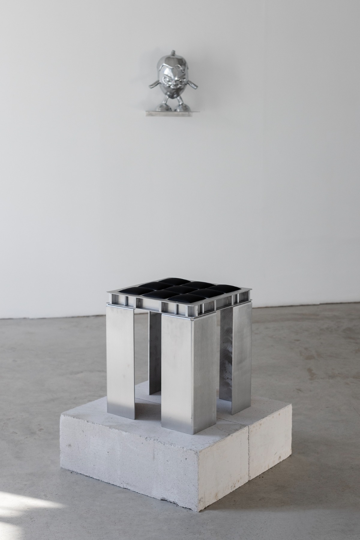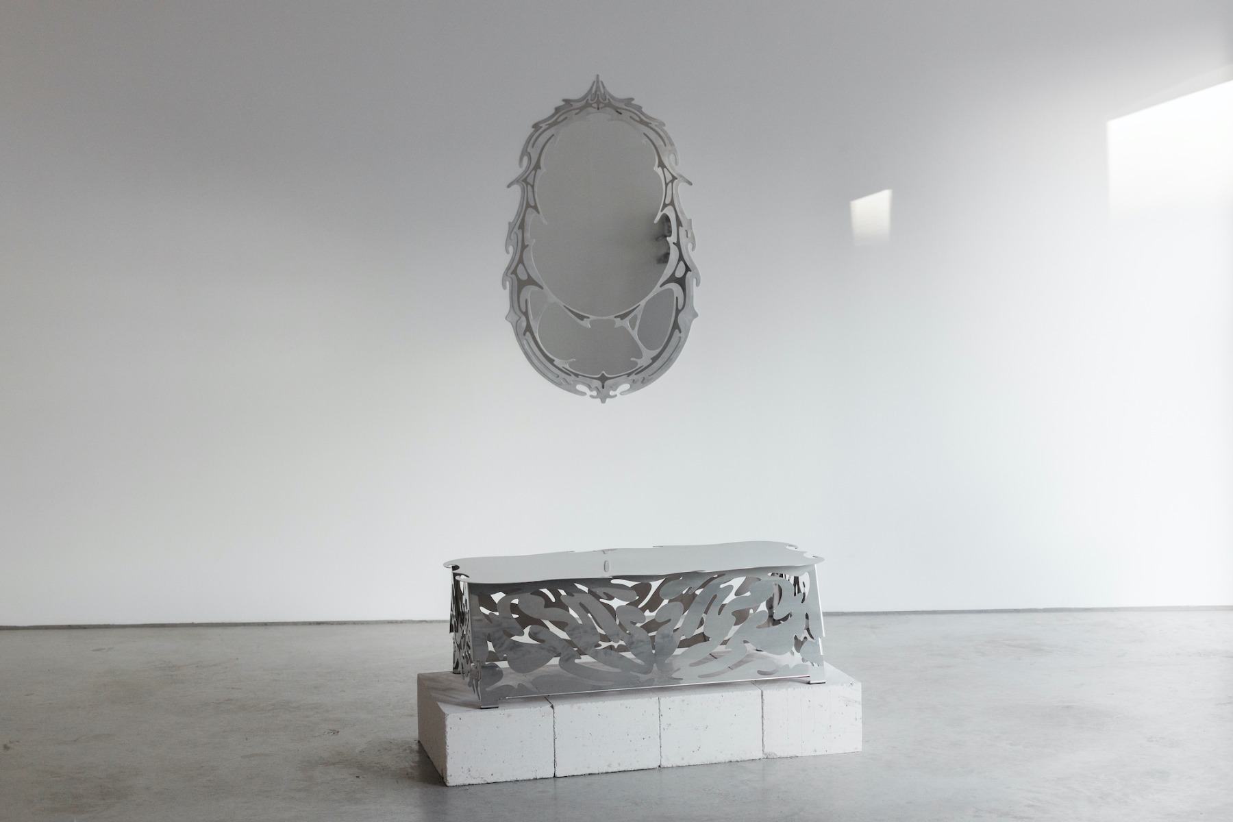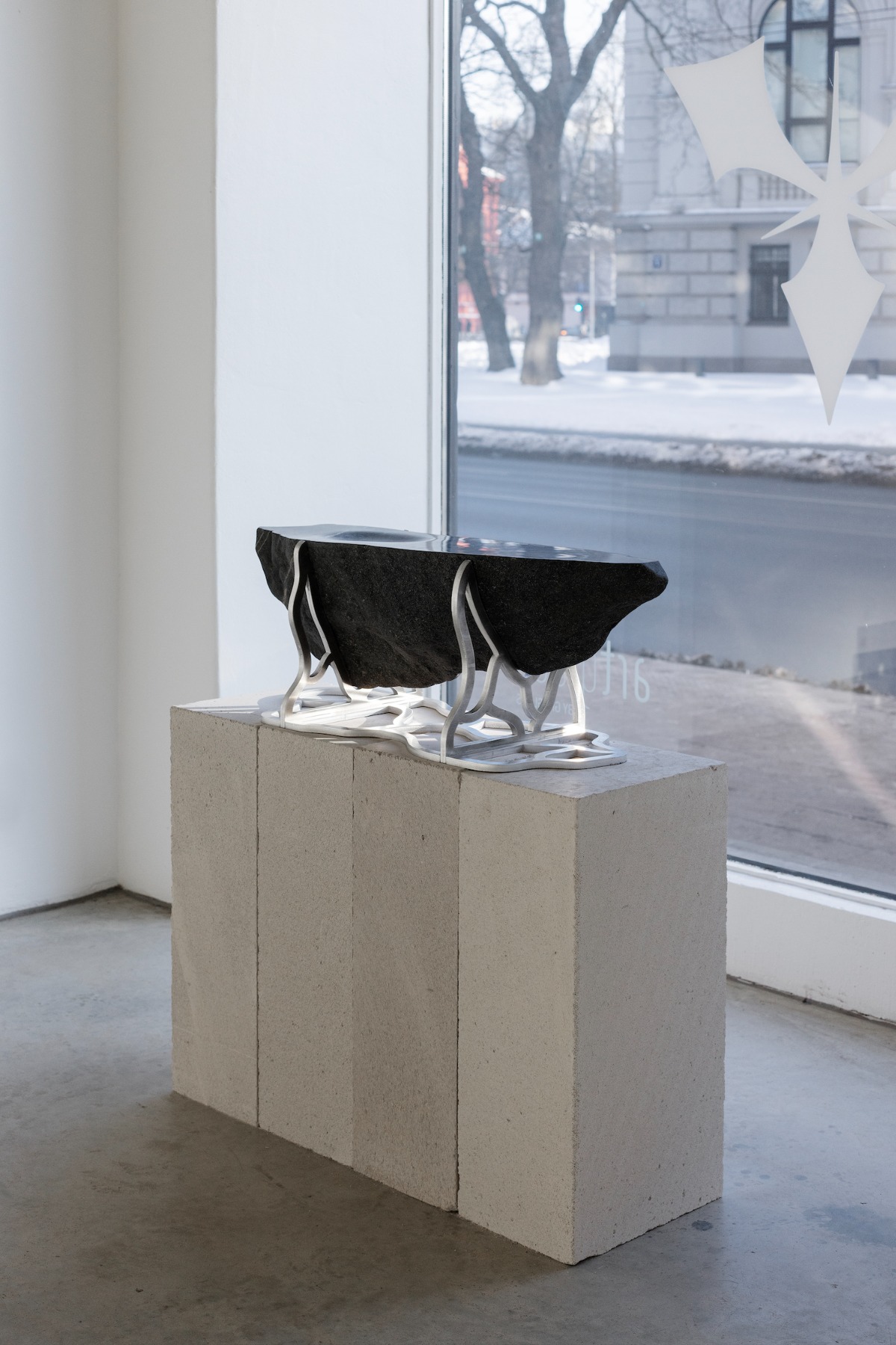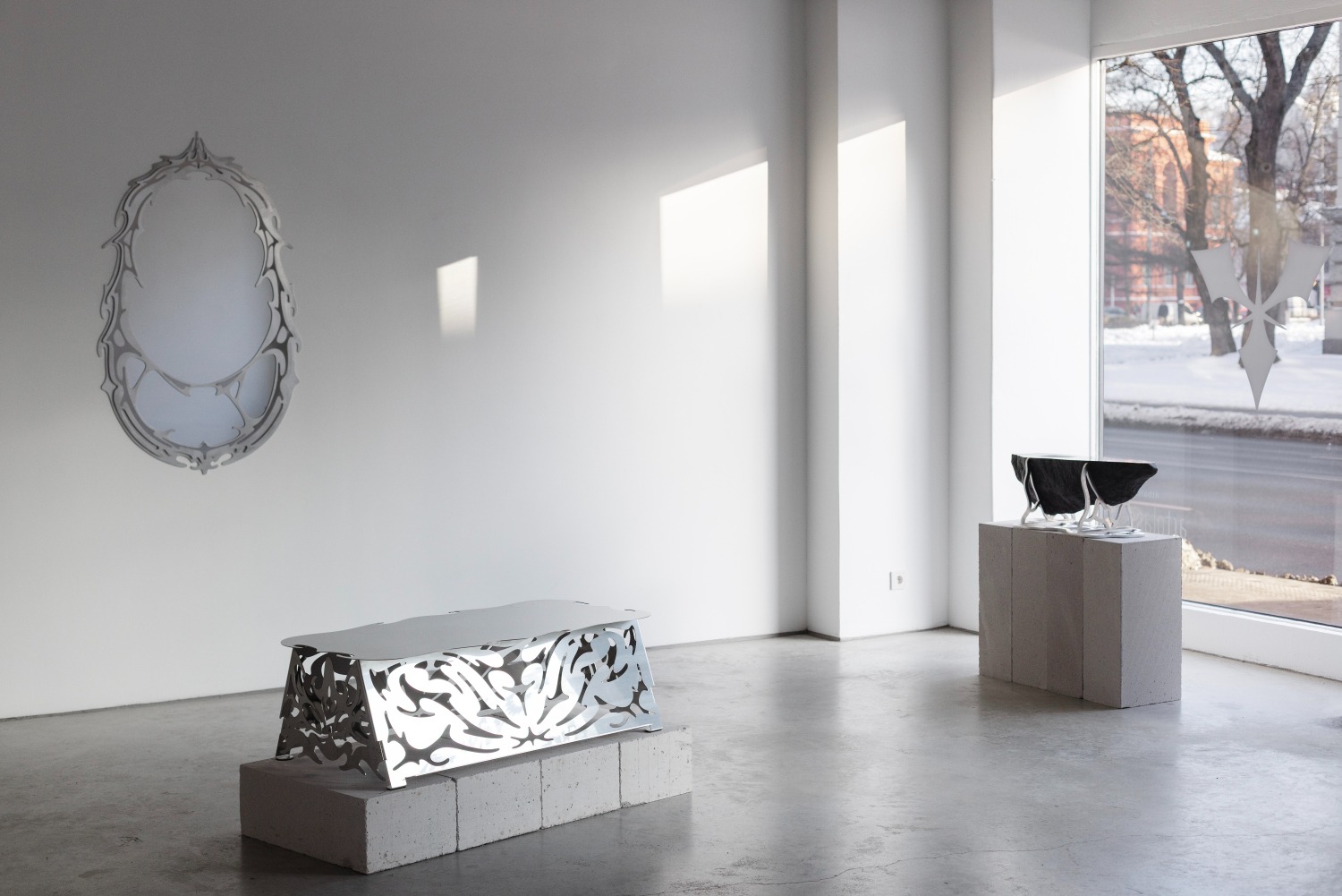Bet, kā viņš pats saka, pēdējā izstādē jau mazāk jūtamas tās idejas un zemteksti, par kuriem rakstīja Šelda. Tomēr arī šoreiz, manuprāt, jūtama šī spriedze starp formām, kas cieši salodētas kopā. Vienlaikus uz dažām no šīm lietām var apsēsties, bet pie citām – sakārtot matus vai noskūties. Šeit ir stikls, akmens, spoguļvirsmas, bet visvairāk tomēr metāls. Tieši par šo materiālu mēs ar Aleksandru runājām galerijā ASNI, kur tikāmies stundu pirms galerijas ikdienišķā darba laika sākuma.