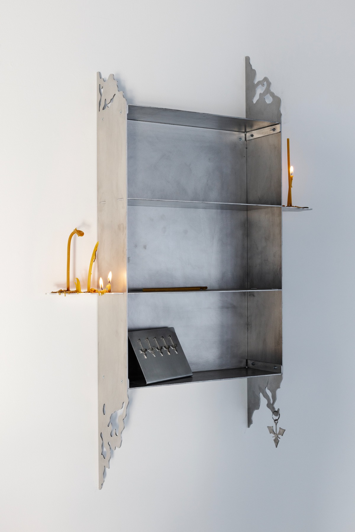 Tā mana pirmā izstāde LOOK’ā bija tīri par to. Tur arī man bija tāds liels lūgšanu krēsls no koka uztaisīts. Man tagad reliģiozas tēmas vairs īsti neinteresē, bet tās formas tāpat kaut kur sēž. Un tās svecītes tomēr izlīda ārā. (Smejas). Kaut kas tajā plauktā bija jāsaliek, citādāk pārāk tukši bija. Bet vispār šeit ir kaut kāda… mistiska pasaka. Nārnija.