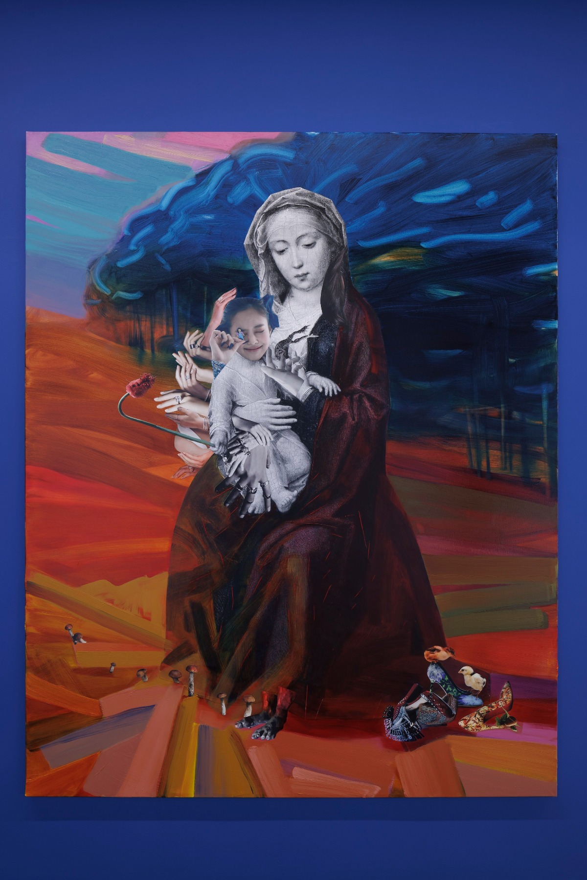 Jā! Vēlējos parādīt, ka Marija ir ļoti daudz staigājusi – viņas kājas ir piekusušas un vairs ne tik jaunas. Blakus malā ir noliktas greznas kurpes. Vienā no tām jau dzīvo gliemezis. Viņa beidzot ļauj savām kājām uzelpot. Tas ir atpūtas brīdis – atsauce uz stāstu “Bēgšana uz Ēģipti”. Marija, Jāzeps un Jēzus tajā ir bēgļi, kuri cieš badu. Klasiskajā glezniecības kanonā bija ierasts atveidot Mariju, sēžam uz kailas klints, kurai apkārt reālistiski uzgleznoti, atpazīstami ziedi. Katram ziedam bija simboliska nozīme. Kāda puķe simbolizēja Marijas pazemību, cita – Jēzus bezierunu pakļaušanos savam uzdevumam. Mans piedāvājums ir šāds: kad Marijai vairs nav jābēg, viņa apsēžas uz klints un apkārt ir ēdamas sēnes. Viņai vairs nekad nebūs jācieš bads. Arī tas, kā viņa tur Jēzus māsiņu – un šajā kolāžā viņa jau ir piedzimusi – ir pavisam citādi nekā klasiskajā kanonā. Renesansē, pirmo reizi mākslas vēsturē, Jēzus tiek attēlots nevis kā valdnieks pilnā augumā (tikai proporcionāli mazāks), bet kā zīdainītis. Ļoti bieži viņš tika gleznots ietīts audeklā, bieži arī kails. Tomēr, lai cik maziņš un kā apģērbts, Marija viņu tur cieņpilni atsvešināti. Bieži starp viņas pieskārienu un Jēzu ir šķidrauts. Var just formalitāti šajā pieskārienā, kas kalpo kā cieņas un bijības žests. Jēzus māsiņu es vēlējos parādīt mīlētu – un mīlēts ir arī pieskāriens, kādu Marija viņai sniedz. To aptver simtiem roku, kas katra glāsta un mierina viņu. Šīs rokas vairs nebaidās. Tās tur viņu kaislīgā mīlestībā.