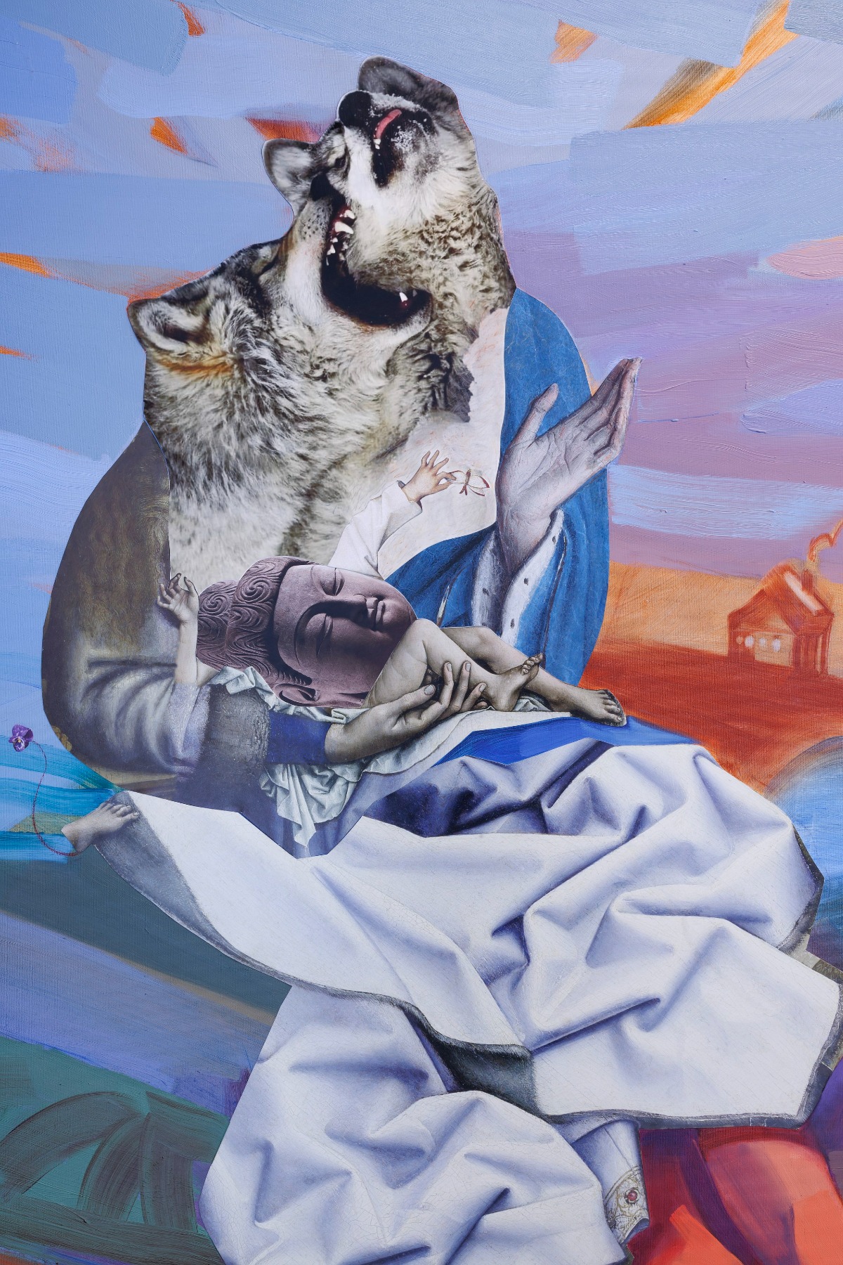 Tu esi viena no retajām latviešu māksliniecēm, kas domā līdzīgi renesanses meistariem, kas katram vismazākajam elementam gleznā piešķīra simbolisku nozīmi. Ko sērijas “Jēzus māsiņa” vienā no kolāžām nozīmē vilku ģimene Jaunavas Marijas vietā?