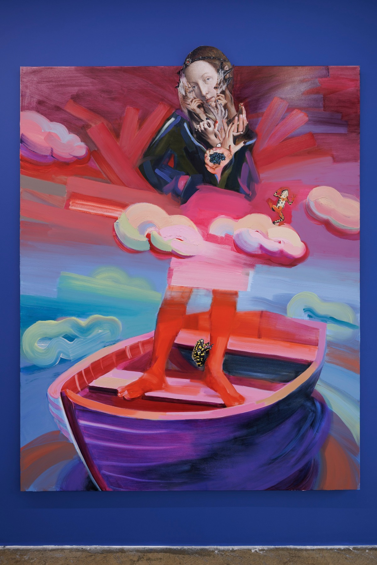 Šī ir stāsta pirmā daļa: Marija pirms Jēzus māsiņas. Pirms izdarītās izvēles, no kuras vairs nav atgriešanās, Marija ir pārdomu brīdī. Sievietēm, kas mūsdienās domā par otra bērna laišanu pasaulē (un es to redzu atkal un atkal no savu draudzeņu pieredzes), tas ir nopietnu šaubu un pat šausmu brīdis. Tāpēc es viņu attēloju pašapzinīgi stāvot, spilgti krāsainā ainavā. Bet, ja ieskatāmies viņas laivā, redzam, ka viņa stāv uz sēdekļa, nevis sēž uz tā. Atliek vien ārpus laivas “notikt” kādam lielākam vilnim vai negaisam, un viņa kristu bezdibenī. Tas stabilitātes brīdis sieviešu dzīvēs pirms otrā bērna laišanas pasaulē ir maldinošs. Vienlaikus viņa ir milzīga – pacēlusies virs mākoņiem, no debesu augstumiem viņa noraugās uz zemi.